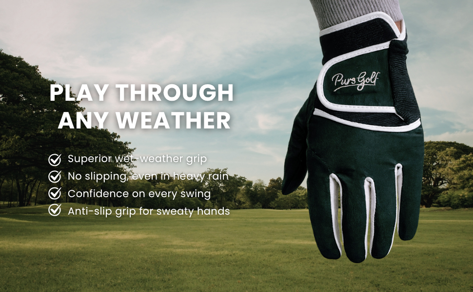 قفازات مطر الجولف التي يمكن إمساكها بشكل أفضل عندما تكون الأيدي مبللة (أو متعرقة) - على عكس الجلد الذي يفشل في الرذاذ. قفازات الجولف المقاومة للماء يثق بها الرجال في أداء جميع الأحوال الجوية من أول قطرة إلى آخر ثقب.