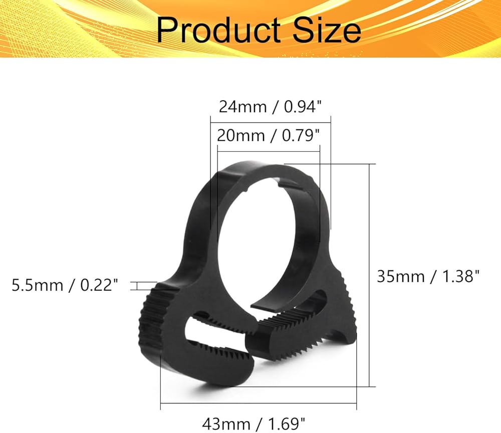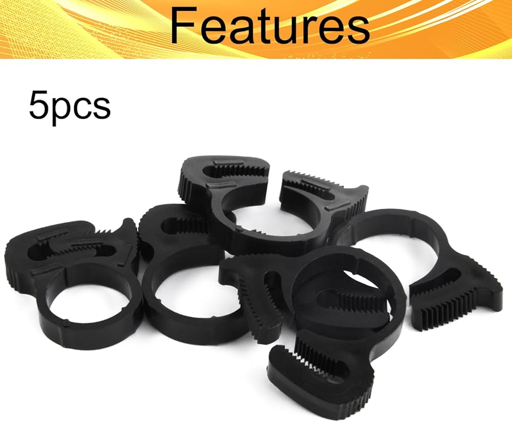 • 1.Specification:Fit Hose Diameter(OD): 17.2mm-19.2mm/0.68"-0.76"; Clamp Thickness: 5.5mm/0.22"'; Material: Nylon; Color: Black; Package Include: 5 Pieces.