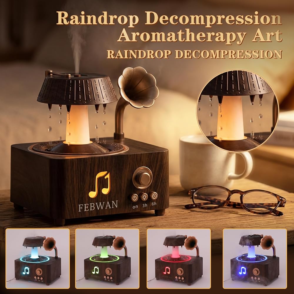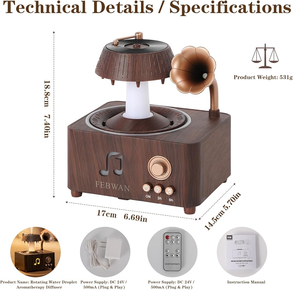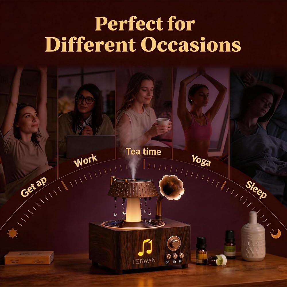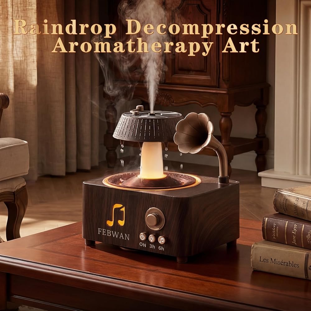• 【🎵 مشغل تسجيل عتيق جمالي مع بلوتوث】 تصميم مشغل تسجيل قديم مبتكر يحول هذا الموزع إلى قطعة ديكور أنيقة لسطح المكتب. تتيح لك مكبرات الصوت بلوتوث المدمجة الاستمتاع بالموسيقى أثناء الاسترخاء في جو عطري وغامر.