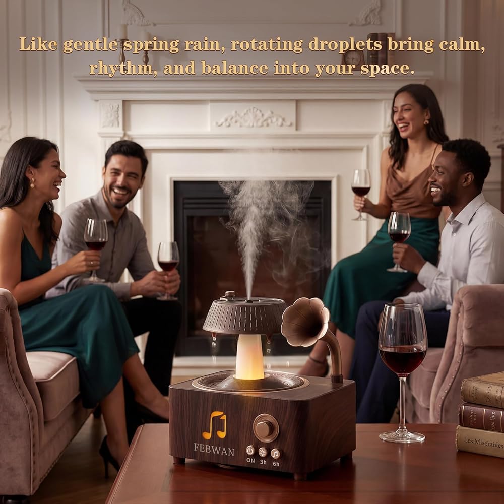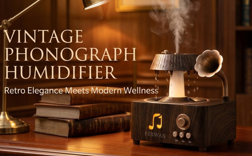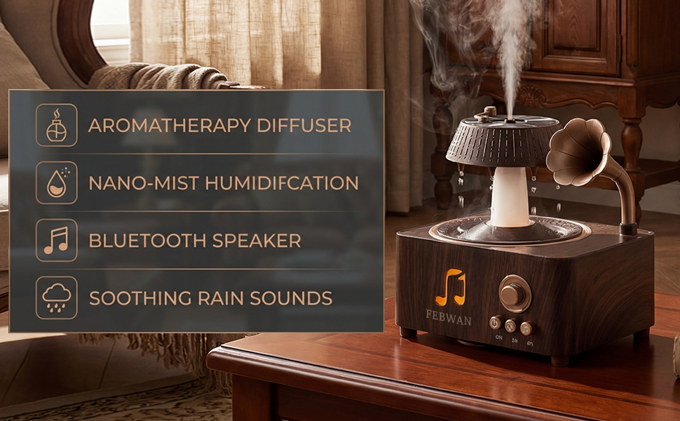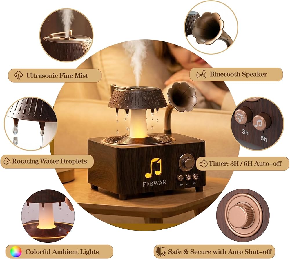 • 【🎵 مشغل تسجيل عتيق جمالي مع بلوتوث】 تصميم مشغل تسجيل قديم مبتكر يحول هذا الموزع إلى قطعة ديكور أنيقة لسطح المكتب. تتيح لك مكبرات الصوت بلوتوث المدمجة الاستمتاع بالموسيقى أثناء الاسترخاء في جو عطري وغامر.