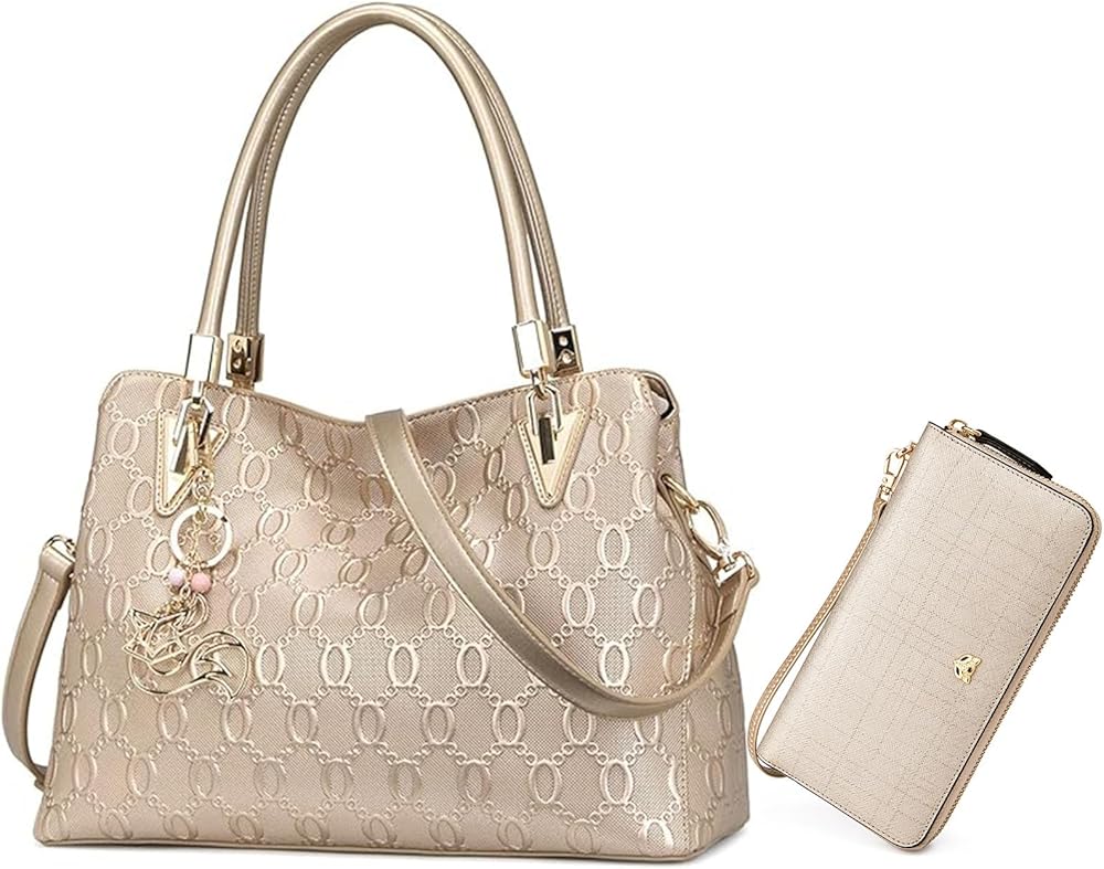 طقم حقيبة يد ومحفظة جلدية مكونة من قطعتين، حقائب كتف نسائية مع محفظة نسائية (ذهبي)