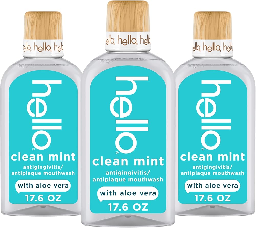 Say hello to a deliciously awesome antiplaque and antigingivitis mouthwash that kicks bad breath to the curb with hello Clean Mint Alcohol Free Mouthwash. This minty fluoride free mouthwash freshens like crazy and is specially formulated to promote healthy gums and moisturize. Thoughtfully crafted with refreshing farm grown mint, aloe vera, coconut oil, and zero alcohol, this no alcohol mouthwash offers a gentle, minty fresh zing without the sting. Swish in style. This hello mouthwash also comes in a reimagined, sleek clear bottle topped with a premium wood grain cap, instantly elevating your bathroom counter space. hello Clean Mint Mouthwash is a non alcohol mouthwash made with no fluoride, no artificial flavors, no artificial sweeteners, no dyes, no alcohol, and no SLS. Now that's a no-brainer. Plus, this fluoride free CPC mouthwash is not tested on animals. With every swish, this minty mouthwash obliterates bad breath and leaves your mouth feeling minty fresh. Show your mouth some love.
