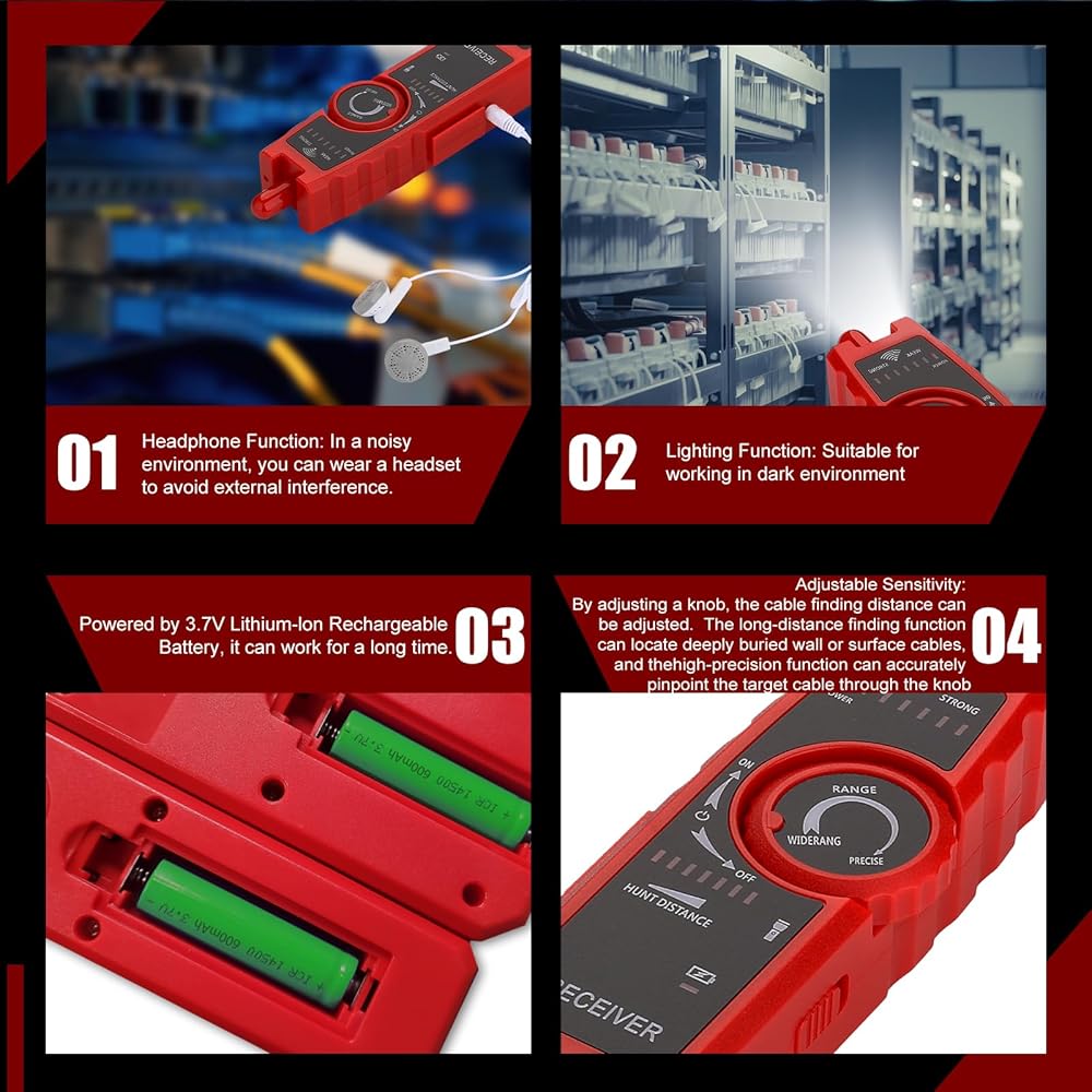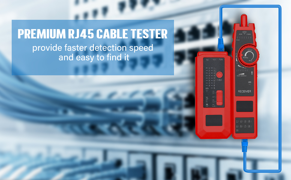 تتبع كابل RJ45 RJ11: يمكن العثور على كابلات RJ11 وRJ45 من خلال جهاز الإرسال. من السهل والسريع العثور على الخط دون تجريد الغلاف الخارجي للكابل
