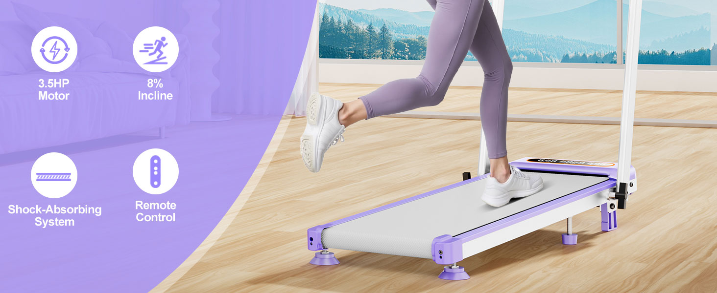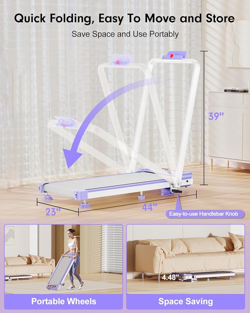 تصميم أرجواني أنيق: يتميز جهاز المشي المحمول الخاص بنا بلمسة نهائية أرجوانية مذهلة تضيف لمسة من الرقي والتفرد إلى مساحة التمرين الخاصة بك. مثالي لعشاق اللياقة البدنية المهتمين بالموضة والذين يرغبون في الجمع بين الأناقة والوظيفة. مثالي للاستخدام المنزلي، أو الشقق الصغيرة، أو أي شخص يتطلع إلى رفع روتين التمارين الخاص به من خلال مجموعة من الألوان.