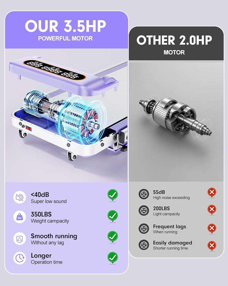 هادئ وقوي 3.5 حصان: جهاز المشي هذا، يوفر المحرك المطور بقوة 3.5 حصان تشغيلًا سلسًا وصامتًا (أقل من 40 ديسيبل) ويدعم ما يصل إلى 330 رطلاً، مما يضمن تمرينًا قويًا وهادئًا للاستخدام في المنزل والمكتب.