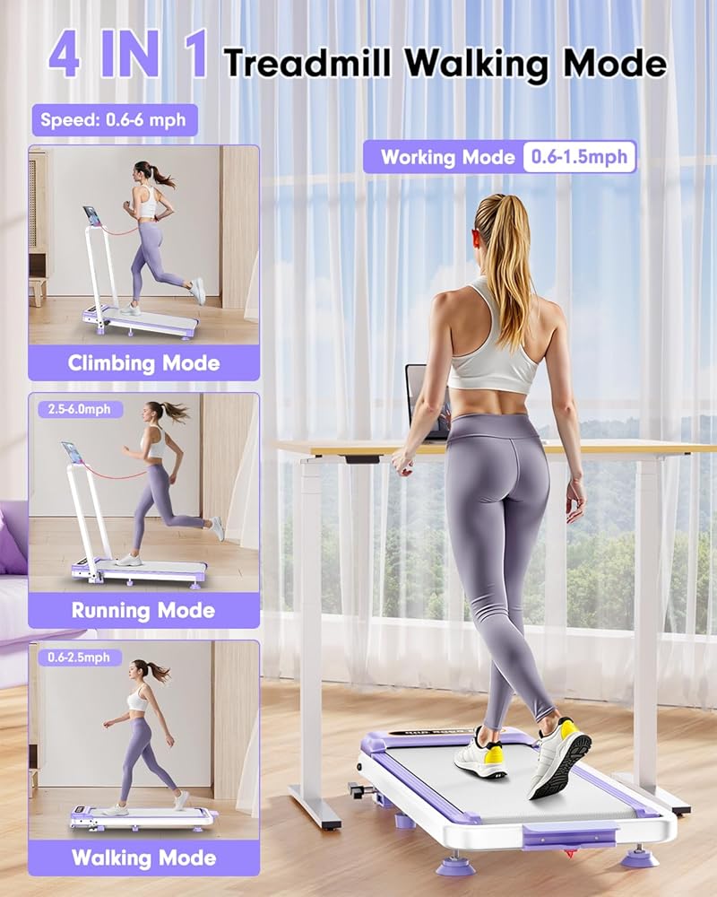 متعددة الاستخدامات 4 في 1: تجمع وسادة المشي هذه ذات الميل بين وسادة المشي، ووسادة المشي القابلة للطي، وجهاز المشي تحت المكتب، ومتسلق التل. استخدمه كجهاز مشي تحت المكتب (0.6-2.5 ميل في الساعة) أو ارفع الدرابزين للركض/الجري (2.5-6.0 ميل في الساعة) مع ميل بنسبة 8% لمحاكاة تسلق التل وحرق سعرات حرارية أكثر بنسبة 150%.
