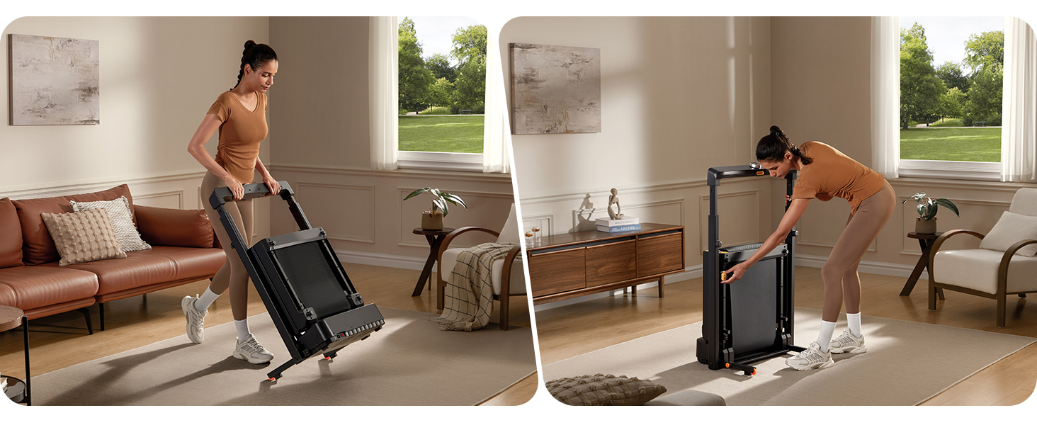 تخزين مدمج ورأسي - على عكس أجهزة المشي التقليدية القابلة للطي، تتميز WalkingPad MX8 بتقنية ثلاثية الطي المتقدمة التي تسمح بالطي على خطوتين مع التخزين العمودي. تعمل أرجل الدعم الممتدة على تعزيز الثبات عند تخزينها في وضع مستقيم، مما يساعد على منع الانقلاب. تشغل مساحة 3 أقدام مربعة فقط عند طيها و9 أقدام مربعة عند فتحها. يعمل هذا الطراز على زيادة الاستفادة من المساحة إلى الحد الأقصى مع الحفاظ على السلامة الهيكلية والأداء الكامل، وهو يكمل بشكل مثالي أنماط الحياة الحديثة المتطورة