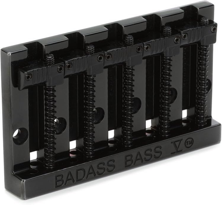 Optimize Your 5-string Bass Guitar's Sound and Sustain Immediately bolster the sustain, stability, and resonance of your favorite 5-string bass with Leo Quan's Badass V bridge! This high-mass piece of hardware is designed as a direct retrofit for 5-string F-style basses with either four or six mounting screws, allowing for both string-through-body and top-loading configurations. Revered by Sweetwater bassists across all styles, Leo Quan Badass bridges boast a heavy-duty high-mass zinc alloy construction, a premium material that provides a significant sustain boost with a sharper attack and exceptional definition. Moreover, each of the Badass V's saddle sports a set of deep grooves that allow you to experiment and fine-tune your string spacing to taste, and the lowest saddle accommodates B strings up to 135 gauge (145 gauge when using taper-wound strings).One Badass legacy The story of Leo Quan's Badass bass bridges begins way back in 1972, a time long before
