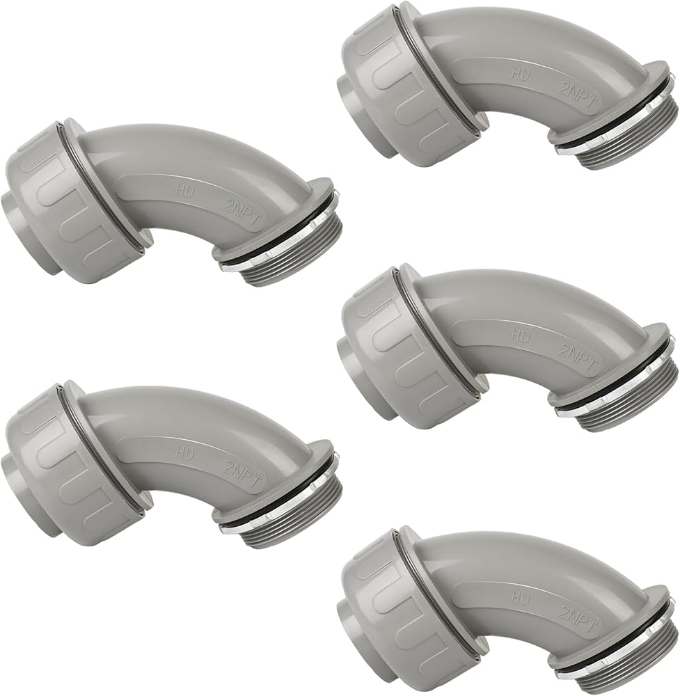 موصلات القناة، موصل سائل محكم مقاس 2 بوصة NPT غير معدني لتركيبات القنوات الكهربائية المرنة البلاستيكية، 90 درجة، مدرج في قائمة UL لأدوات الأنابيب المنزلية الخارجية، رمادي (5 عبوات)