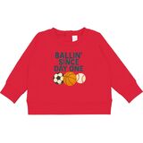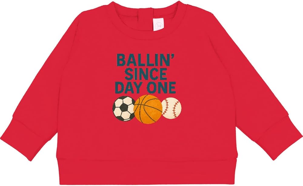 Show off your love for sports with this cool "Ballin' Since Day One" design, featuring a soccer ball, basketball, and baseball. Perfect for any sports enthusiast, this Baby Sweatshirt captures the essence of being a true fan.