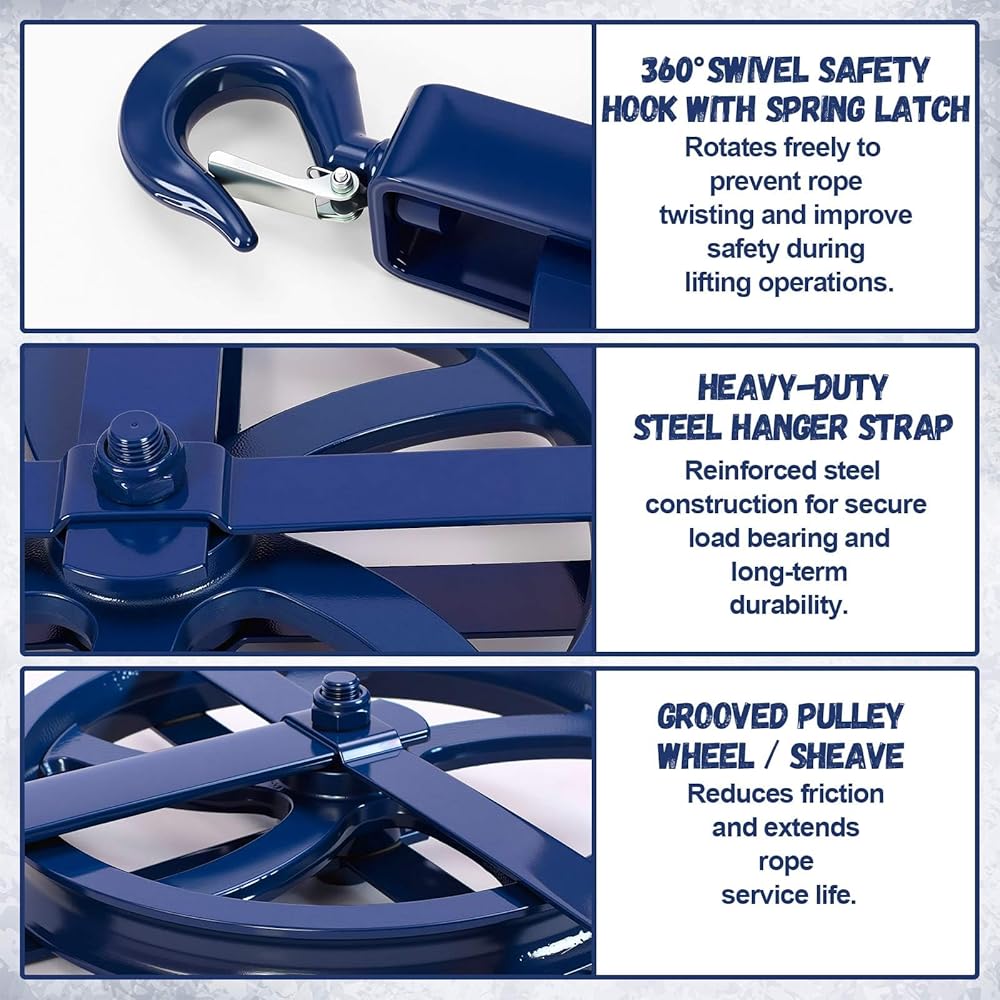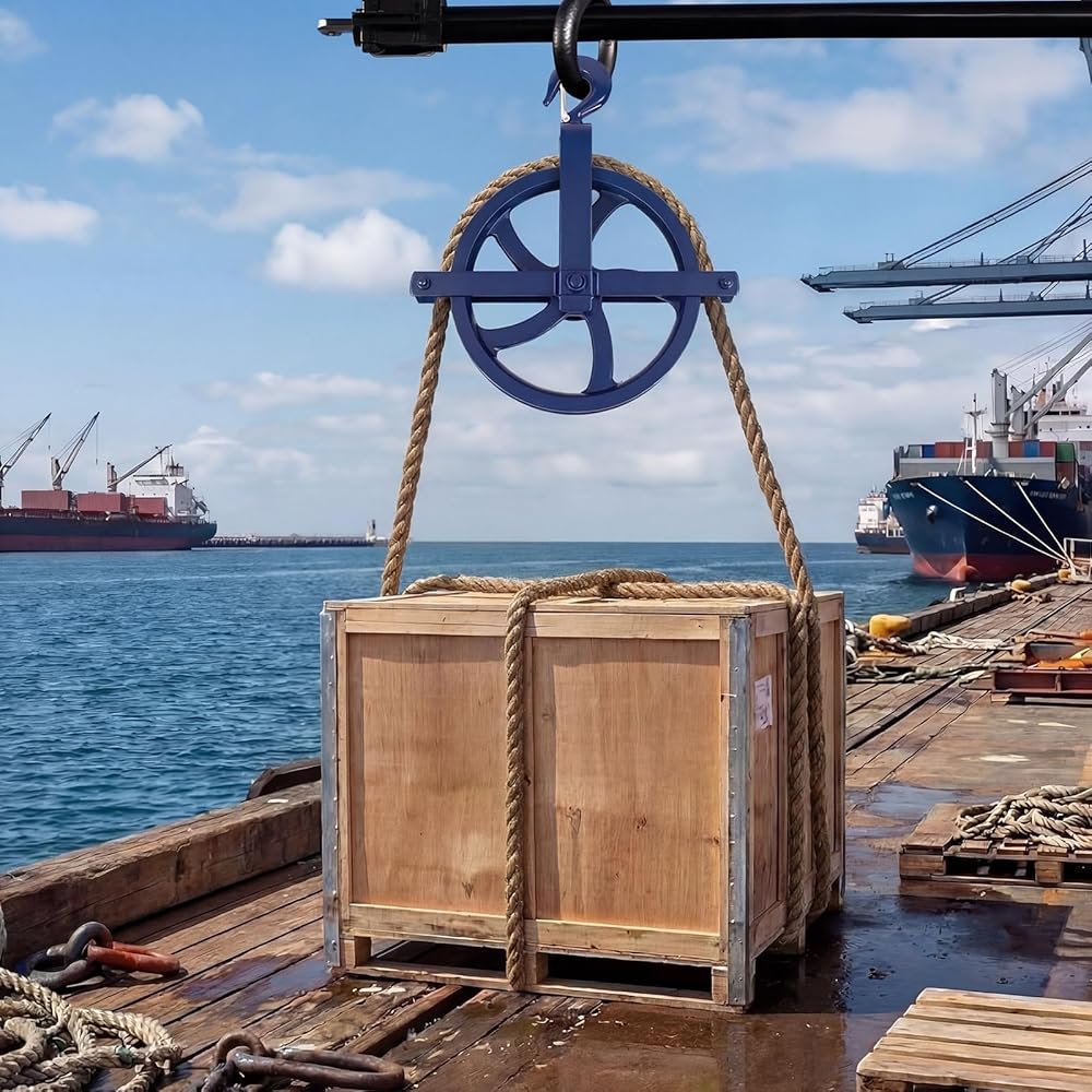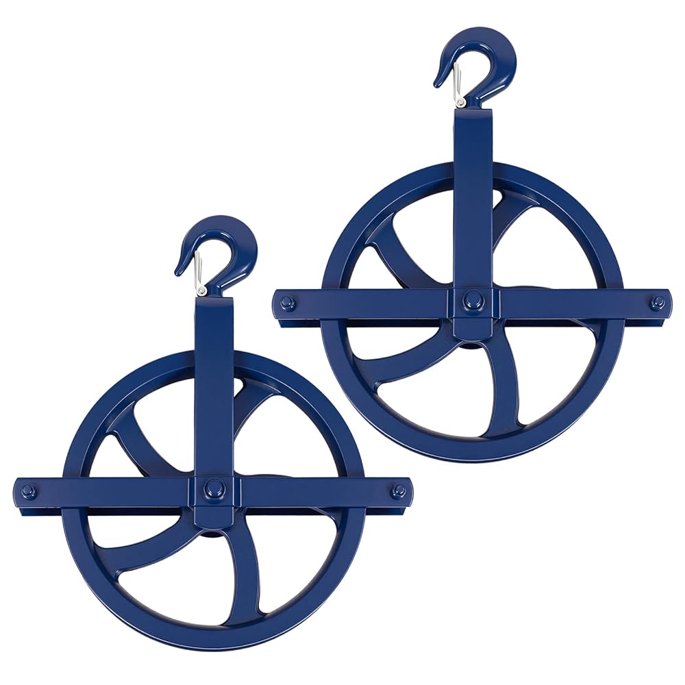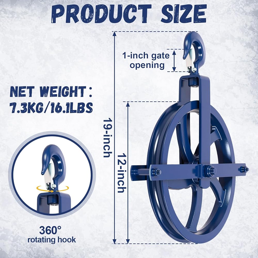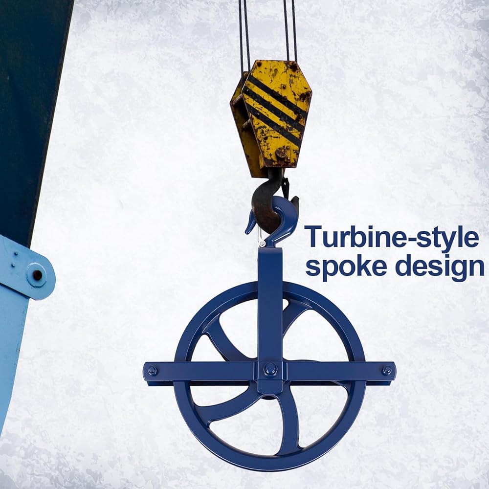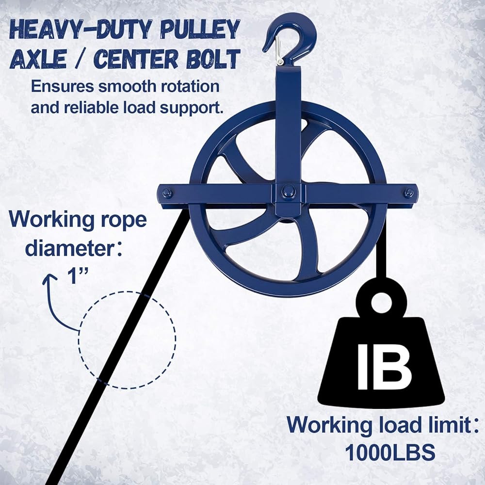 Engineered with solid cast iron construction and a 12-inch diameter wheel, this pulley set delivers exceptional strength and smooth operation for efficient material handling. Rated for a 1000 lbs working load, it is compatible with 7/8 inch and 1 inch ropes, making it the ideal powerhouse for scaffold hoist, construction, and warehouse rigging tasks.