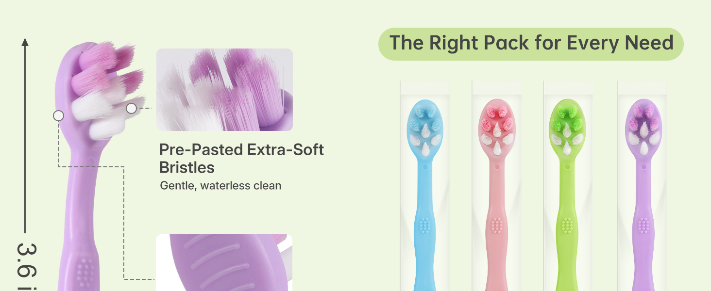 • فرشاة أسنان مسبقة اللصق مع معجون أسنان (بدون أنبوب): يتم وضع معجون النعناع مسبقًا على الشعيرات (تم لصقه مسبقًا)، وخالي من الفلورايد. فرشاة أسنان ومعجون أسنان في مجموعة واحدة للبالغين - جاهزان للاستخدام وفوري للانتعاش السريع بعد تناول القهوة أو الوجبات أو قبل الاجتماعات.