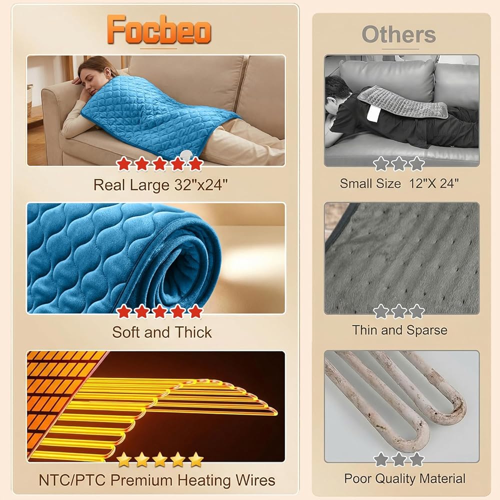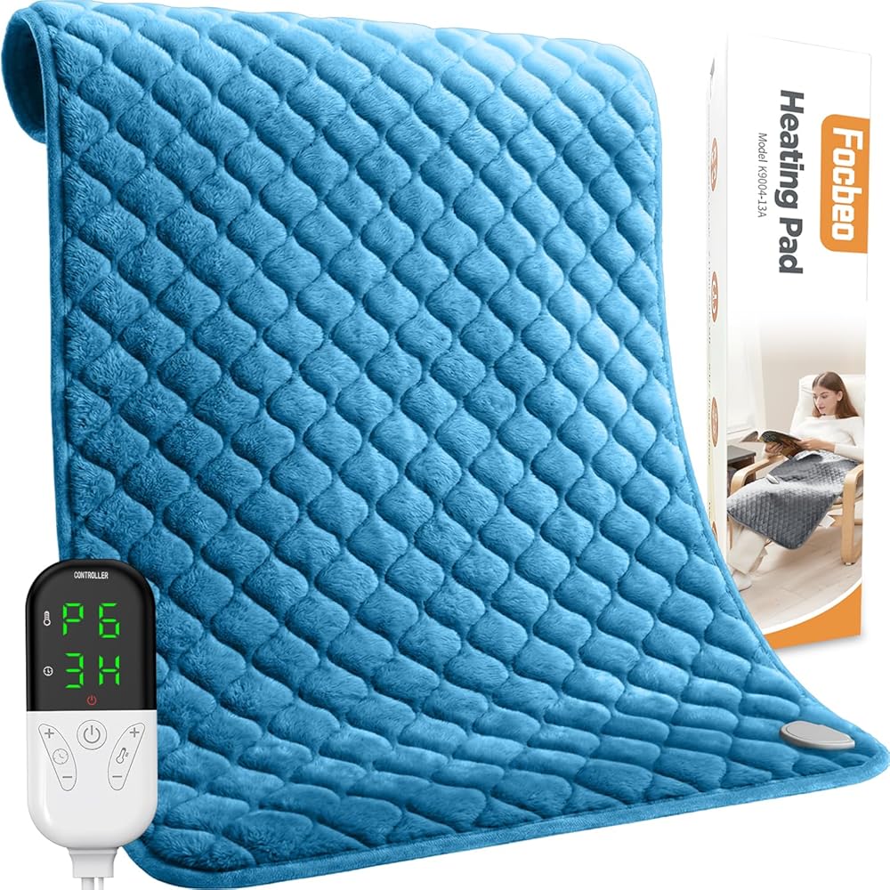 The Focbeo extra large heating pad provides physical heat therapy, the extra large coverage area of the back and shoulder heating pads relaxes muscles and effectively relieves body aches and pains and menstrual cramps. The body heating pad features multiple temperature settings and timed automatic shut-off for safety and energy efficiency.