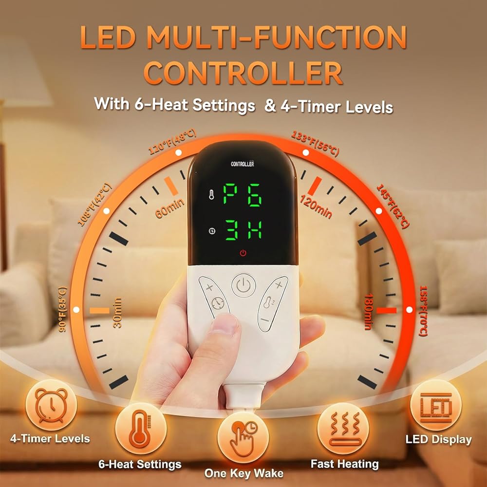 【CONVENIENT TEMPERATURE CONTROL SYSTEM】The heating pad is equipped with a digital display controller that can be easily adjusted to a comfortable temperature with 6 temperature settings:90°F/108°F/120°F/133°F/145°F/158°F. The electric heating pad has a timed shut-off function with 4 timed auto shut-off ranges(30min/60min/2h/3h) and an auto shut-off, auto-protection feature that ensures your safety and saves energy.