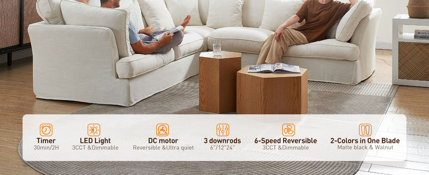 مروحة قابلة للتعديل: مراوح السقف السوداء هذه مجهزة بجهاز تحكم عن بعد متعدد الوظائف، وطريقتين للتحكم عن بعد (مفتاح حائط محمول/ثابت)، ولها 6 سرعات رياح، وتعديل سطوع ضوء LED 22 وات، و3 درجات حرارة ألوان (3000 كلفن/4000 كلفن/6000 كلفن)، ووظيفة التوقيت (30 دقيقة/2 ساعة). بالإضافة إلى ذلك، يمكن استخدام مفتاح الحائط لتشغيل الضوء (بدون مروحة)، وإيقاف المراوح والأضواء بنقرة واحدة