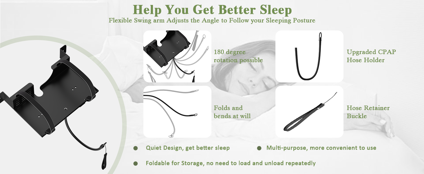 حامل خرطوم CPAP المرن مع دوران 180 درجة: معظم حاملي الخراطيم لديهم ارتفاع وزاوية ثابتة، مما يحد من استخدامها. تتميز دعامات خرطوم ضغط المجرى الهوائي الإيجابي المستمر (CPAP) بارتفاعها وزاويتها القابلة للتعديل، مع ذراع متأرجح مزود بنابض يدور 180 درجة وقابل للتعديل. وهذا يعني أنه بغض النظر عن مقدار القذف والدوران أثناء النوم، ستجد دائمًا الوضع المثالي لخرطومك، لذلك يمكنك أن تقول وداعًا لخلع قناع الأكسجين أو تشابك الخرطوم والاستمتاع بنوم جيد ليلاً بحرية وراحة.