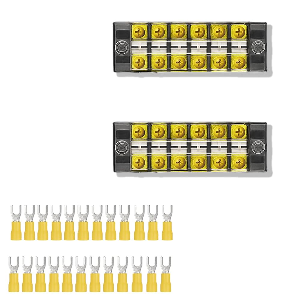 **Package Includes:** - 2 sets of 6-position dual-row terminal blocks - 24 insulated fork wire connectors, conveniently packaged This comprehensive set is designed to meet your wiring needs with efficiency and reliability.