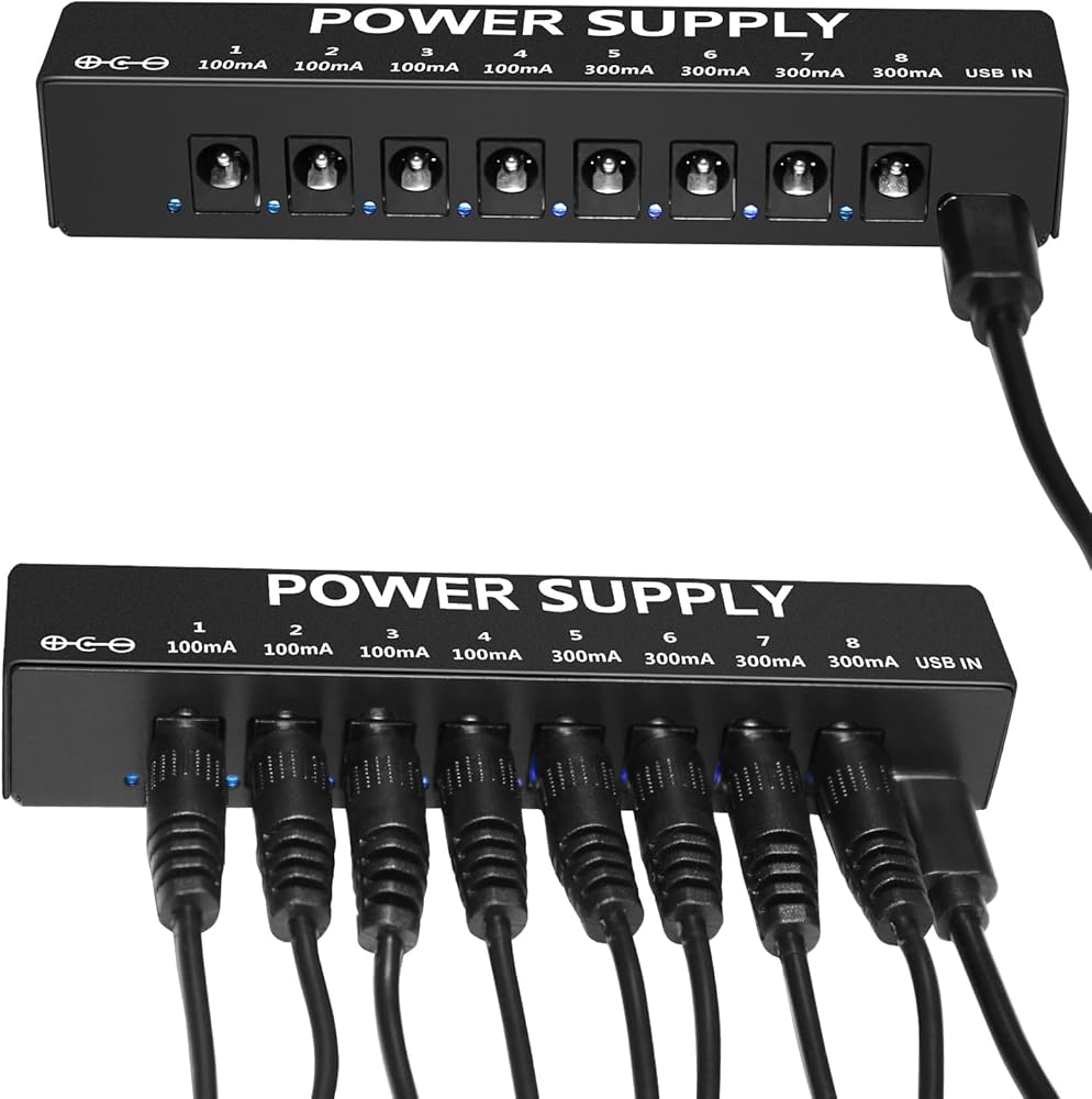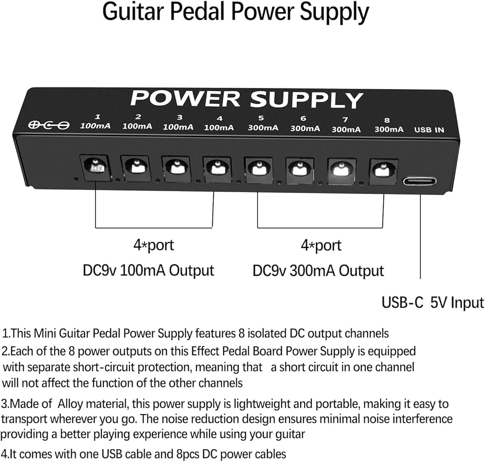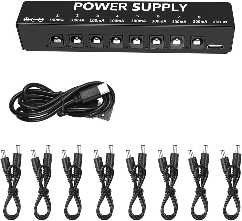 • 3. Designed specifically for use with guitar effectors, this power supply requires a Type-c 5V 2A. The package includes 8 power cables