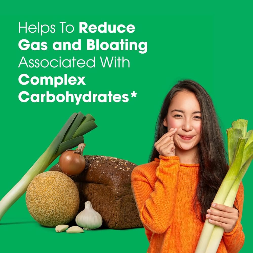 راحة سريعة المفعول - تعمل بشكل مباشر عند تناول وجبات غنية بالفركتانز أو الجالاكتان، مما يقلل من خطر تكوين الغازات ويدعم صحة الجهاز الهضمي المتوازنة.