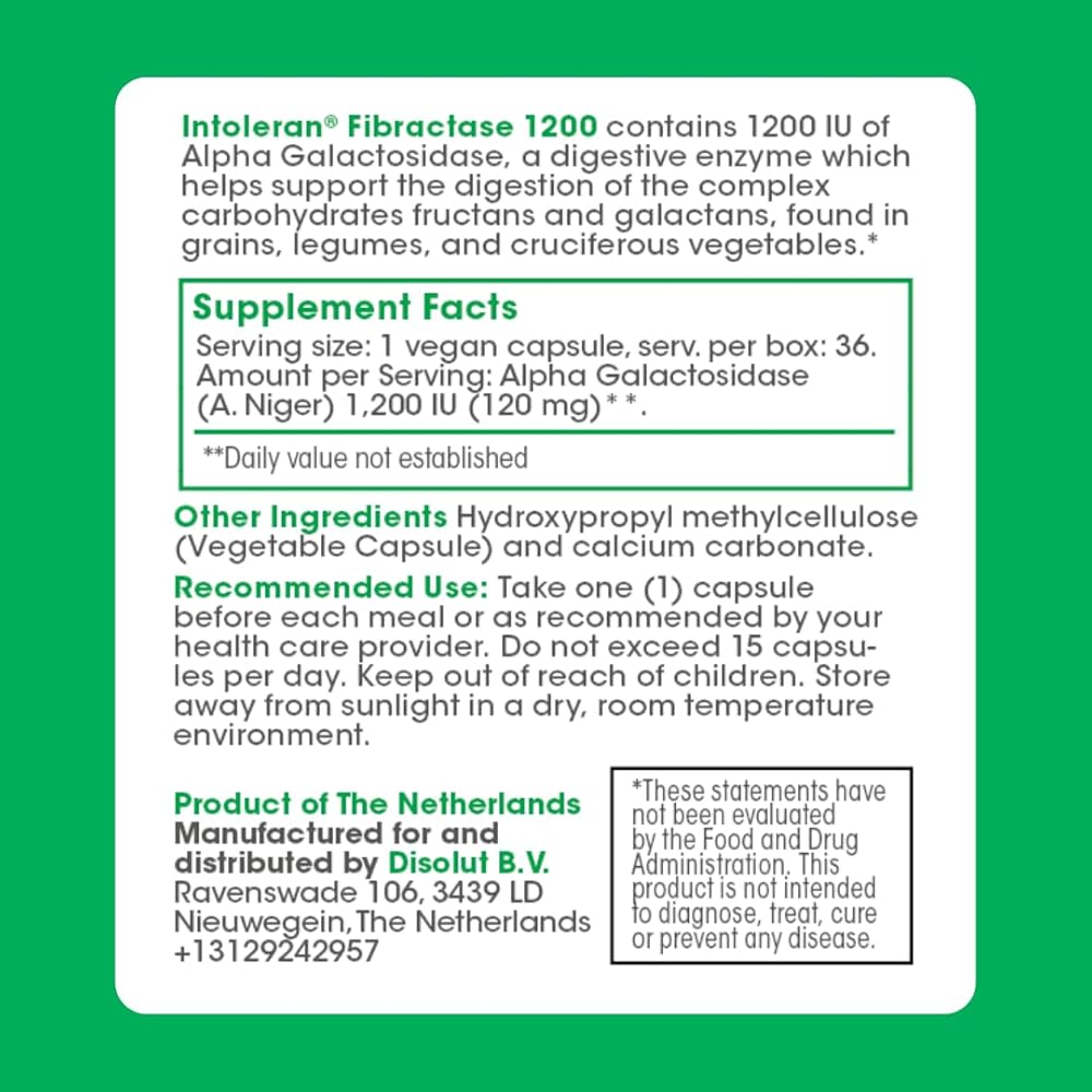 إنزيم ألفا جالاكتوسيداز - تحتوي كل كبسولة على 1200 وحدة من ألفا جالاكتوسيداز، وهو إنزيم هضمي رئيسي يكسر الكربوهيدرات المعقدة مثل الفركتانز والجلاكتانز الموجودة في الحبوب والبقوليات والخضروات الصليبية.