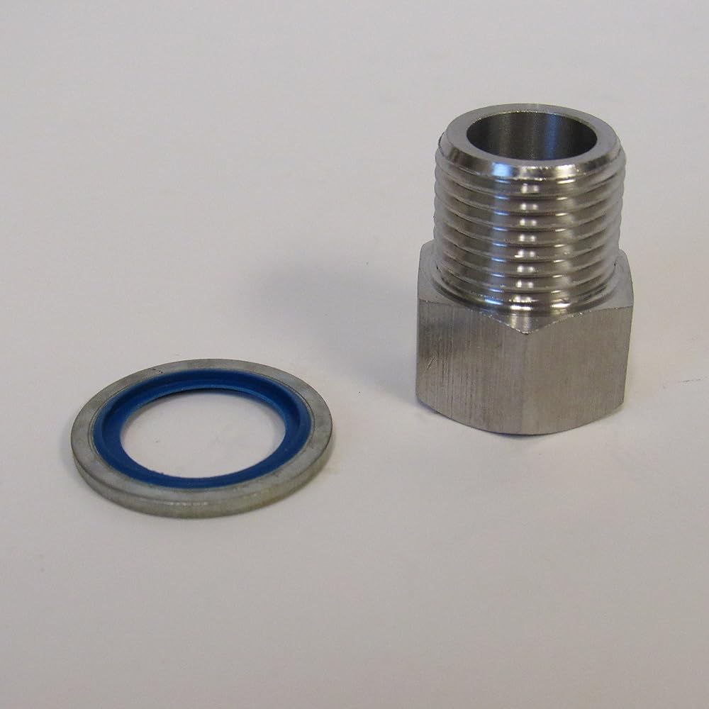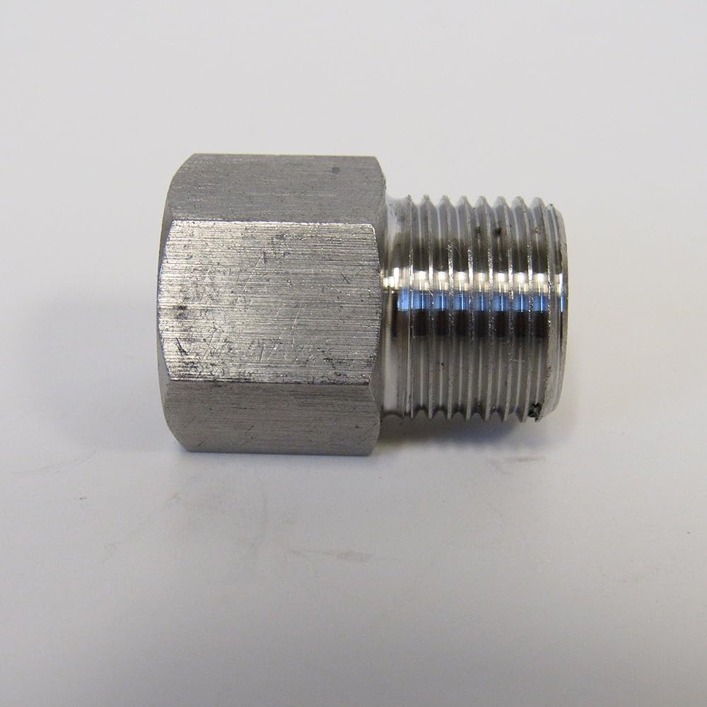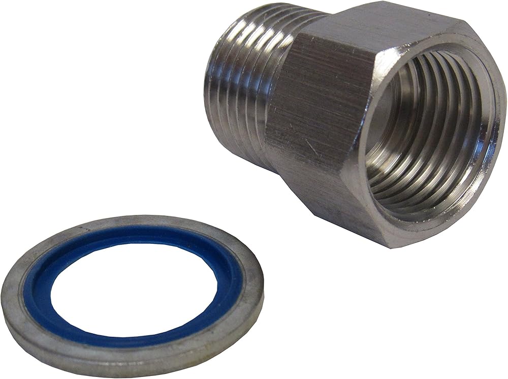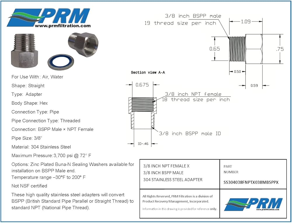 محول من الفولاذ المقاوم للصدأ 3/8 بوصة NPT أنثى × 3/8 بوصة BSPP ذكر مع غسالة مانعة للتسرب، غسالة فولاذية مطلية بالزنك مع ختم Buna-N، أقصى ضغط 3700 رطل لكل بوصة مربعة، نطاق درجة الحرارة -30 درجة فهرنهايت إلى 200 درجة فهرنهايت
