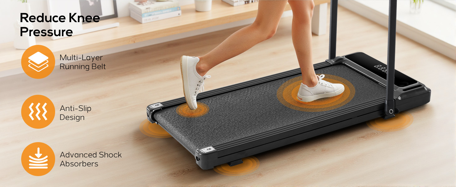 تصميم المقبض ثنائي الاستخدام: قم بالتبديل بين وضع وسادة المشي مع رفع المقابض ووضع جهاز المشي تحت المكتب مع طي المقابض. جهاز المشي المحمول هذا ذو المقابض يناسب المساحات الصغيرة مع توفير الثبات وتعدد الاستخدامات.