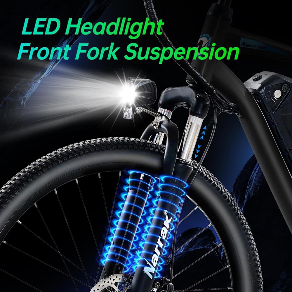 【Peak 1100W High performance Electric Mountain Bike】Narrak full suspension ebikes for adults is upgraded with a 750W(peak 1100W) high-efficiency brushless hub motor, providing you more power and excellent uphill capabilities, boosting the max speed up to 26 MPH. Whether you're commuting or exploring new routes, the Narrak electric mountain bike delivers exhilarating acceleration and consistent power.