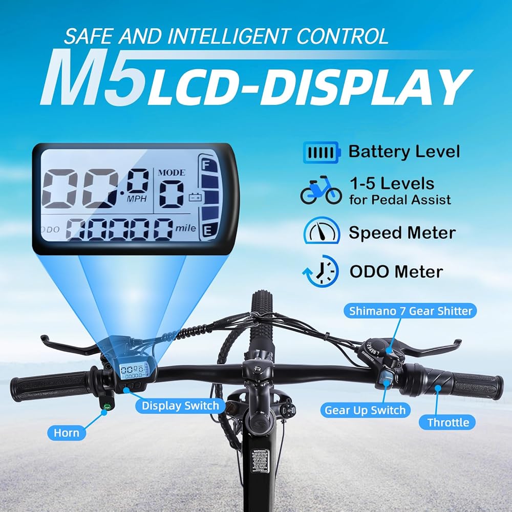 【Enhanced Riding Experience】Elevate your journey with our electric mountain bike, featuring an intuitive LCD screen that displays speed, battery level, and assist level for effortless ride tracking. Equipped with top-notch front and rear disc brakes, the bike ensures reliable all-weather stopping power. Front safety light and 7-speed gear system with pedal assist combine to offer a ride that's both comfortable and secure, making it ideal for any adventure.