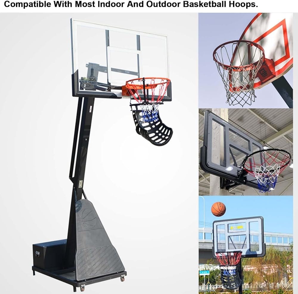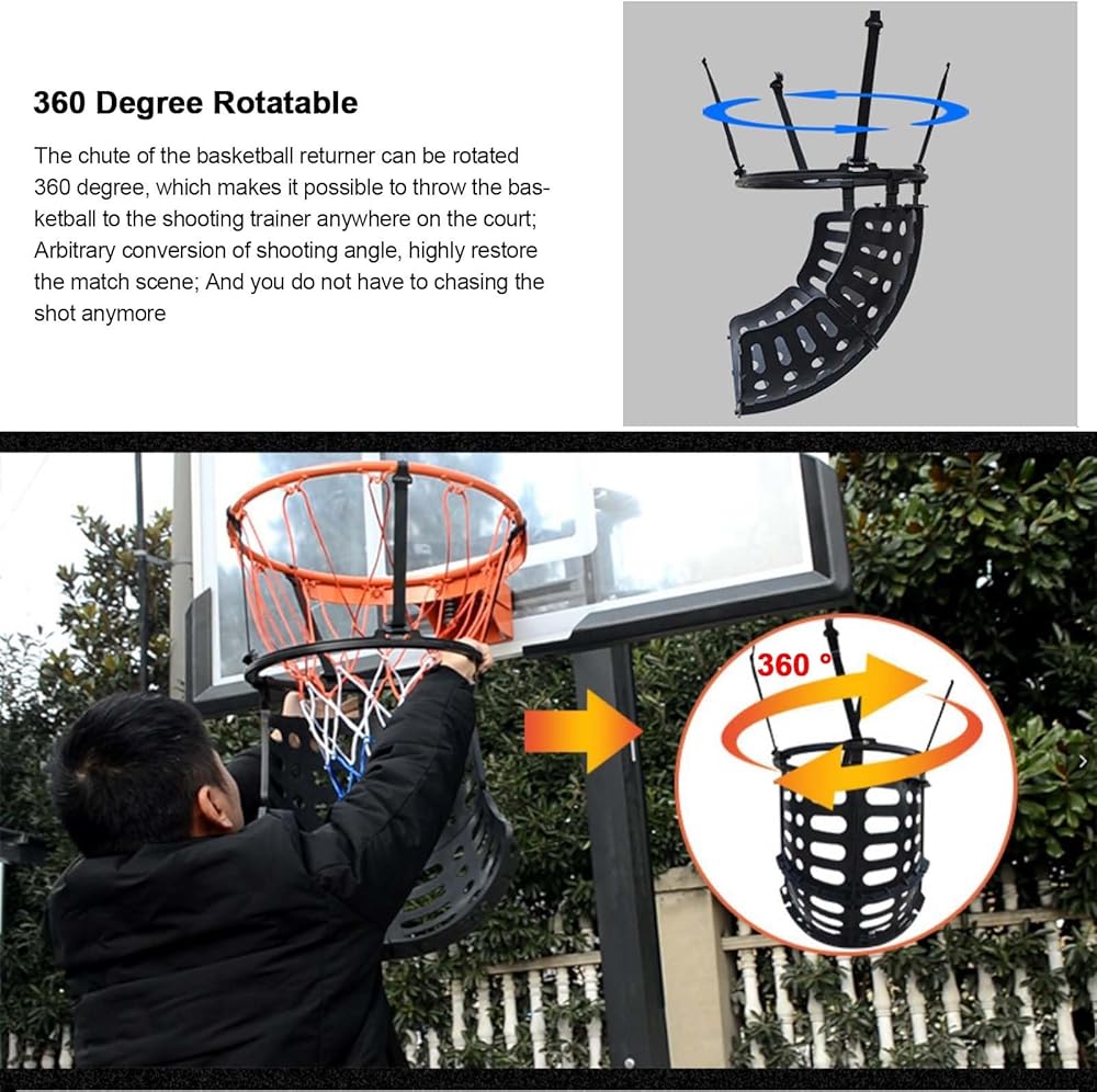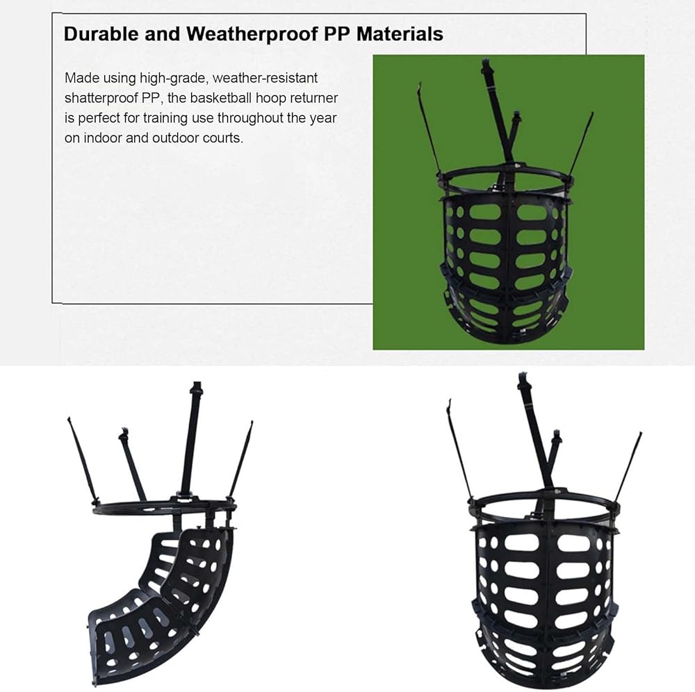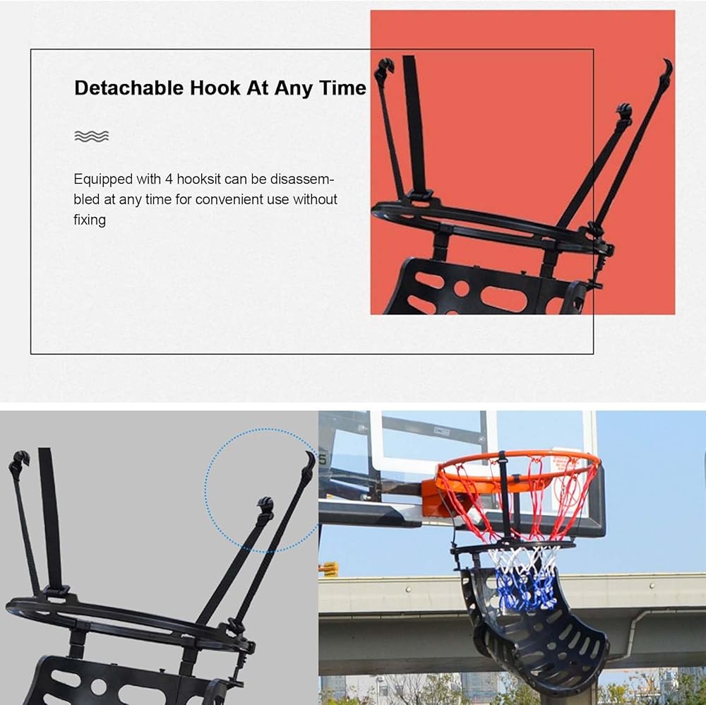 Quick And Easy To Assembly: The part of our basketball return system connected to the rim is fixed with four equidistant plastic hooksThe adjustable and height-fit design makes it suitable for most sizes of basketball hoop and is not easy to fall off and moveThe clip design without additional tools allows you easily and quickly to install or remove the ball returner giving you more time for shooting practice.