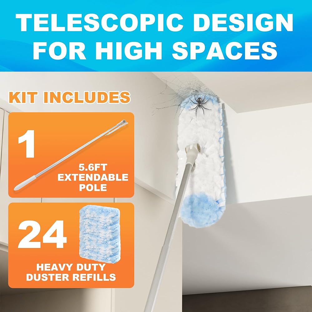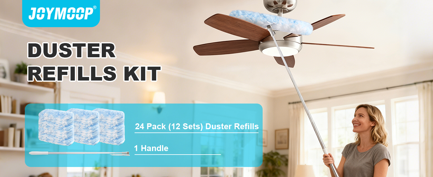 مقبض منفضة JOYMOOP قابل للتمديد بطول 6 أقدام مع 24 عبوة ثقيلة، متوافق مع عبوات منفضة سويفر، وسادات غبار من الألياف الدقيقة للاستعمال مرة واحدة لتنظيف المنزل، والسقف، والمروحة، والنوافذ، والمناطق التي يصعب الوصول إليها