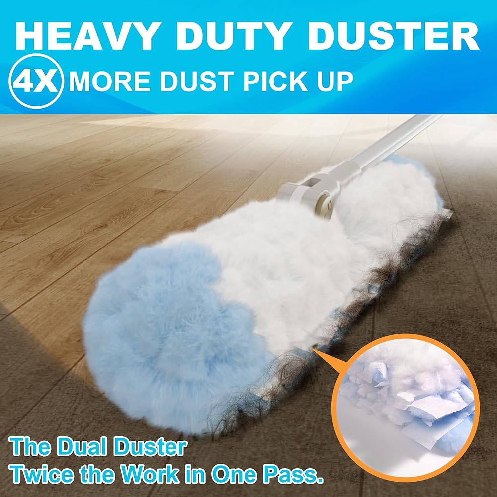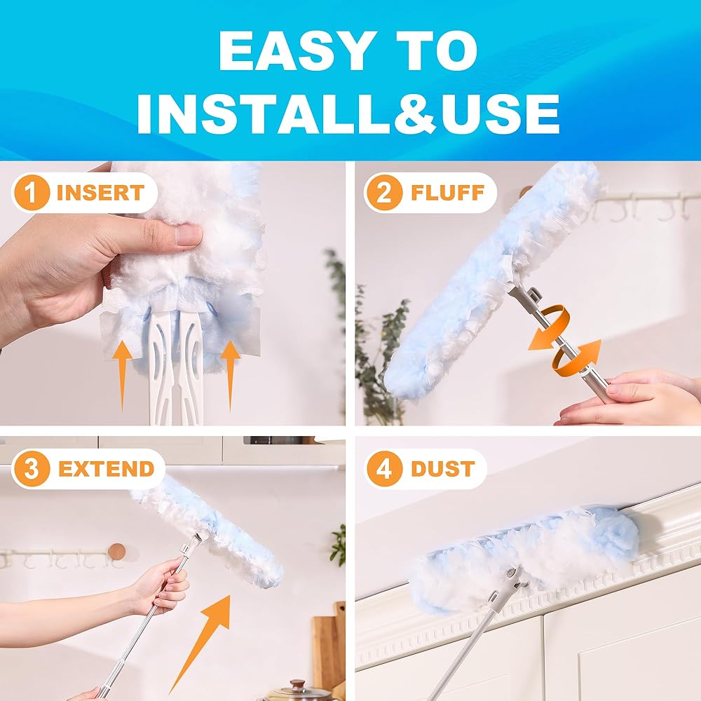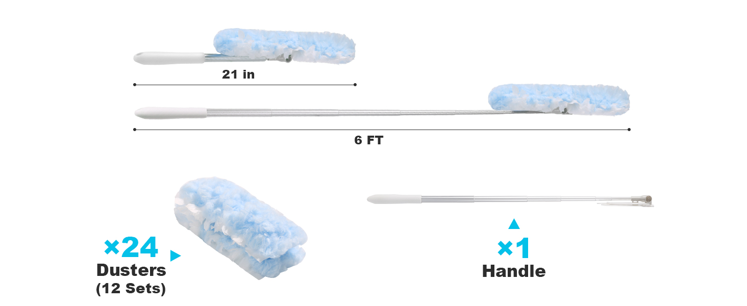 [سهل الاستخدام] يتضمن 24 عبوة إعادة تعبئة (12 مجموعة) يمكن ضبطها على المقبض. ما عليك سوى كشطها لأعلى لتنفض ألياف المنفضة وتعزيز الكهرباء الساكنة لالتقاط الغبار بشكل أفضل، ثم اكشطها للأسفل لإزالة الغبار والشعر بسرعة من رأس المنفضة