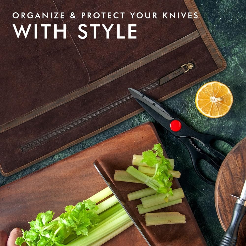 جلد محبب بالكامل وحرفية ممتازة: حقيبة حمل السكاكين هذه هي أفضل حقائب الطهاة للسكاكين والأدوات للمحترفين الذين يقدرون الجودة والأناقة. مصنوع يدويًا من جلد أصلي محبب بالكامل، ويوفر الجزء الخارجي ملمسًا غنيًا ومقاومًا للثقب ومتانة طويلة الأمد. من الداخل، تعمل الوسائد الداخلية المصنوعة من الجلد السويدي الطبيعي الناعم على حماية سكاكينك من الخدوش. مع حقيبة تخزين بسحاب وأشرطة ملفوفة، فهي واحدة من أفضل حقائب السكاكين للطهاة المحترفين الذين يطلبون الأناقة والأداء.