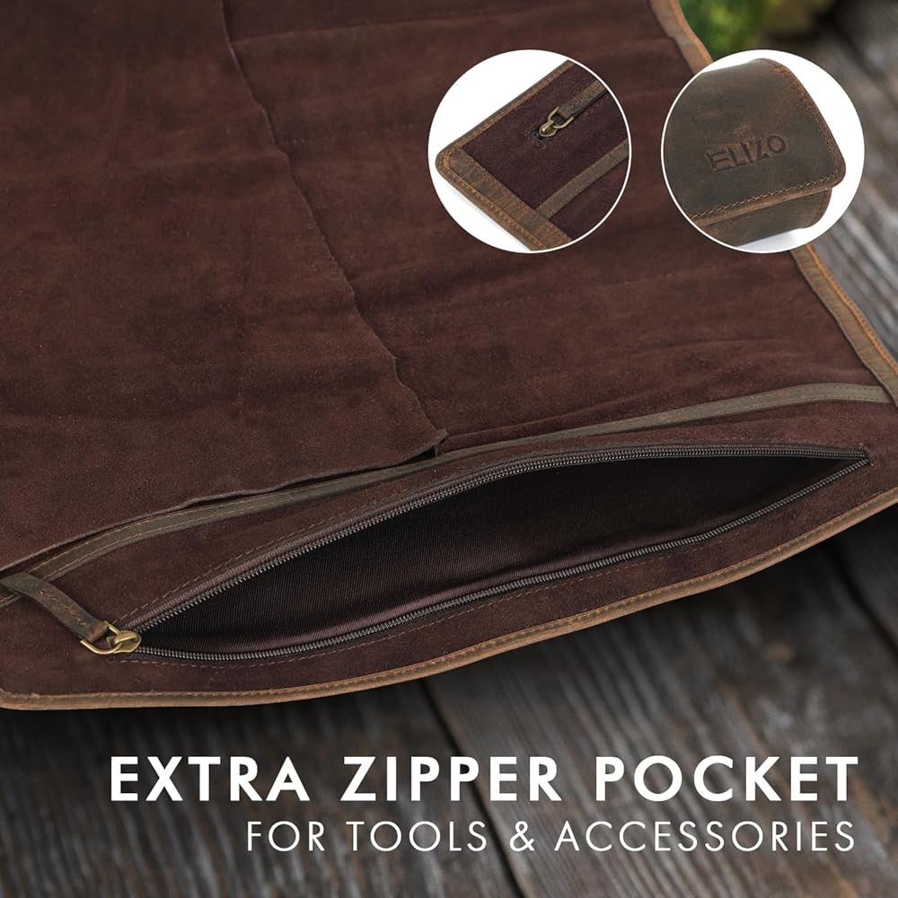 تخزين آمن ومنظم: صُممت حقيبة السكاكين الجلدية هذه لتتعدد الاستخدامات، وهي مثالية للطهاة المحترفين ومحبي الشواء والطهاة المنزلية. يحمل تصميم لفة الطهاة ما يصل إلى 4 سكاكين مع فتحتين كبيرتين مقاس 4.5 بوصة للقواطع، وفتحة متوسطة مقاس 3 بوصة، وفتحة صغيرة مقاس 1.5 بوصة. يشتمل على جيب بسحاب مقاوم للماء مقاس 8 × 17 بوصة للأدوات أو الملحقات. تُغلق حقيبة سكين المطبخ هذه بأمان بحزام عريض عالي التحمل، وإبزيم نحاسي عتيق، وسحاب YKK، مما يوفر المتانة التي يجب أن يتمتع بها كل غلاف سكين وحقيبة الطهاة.