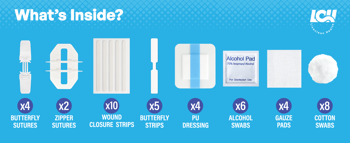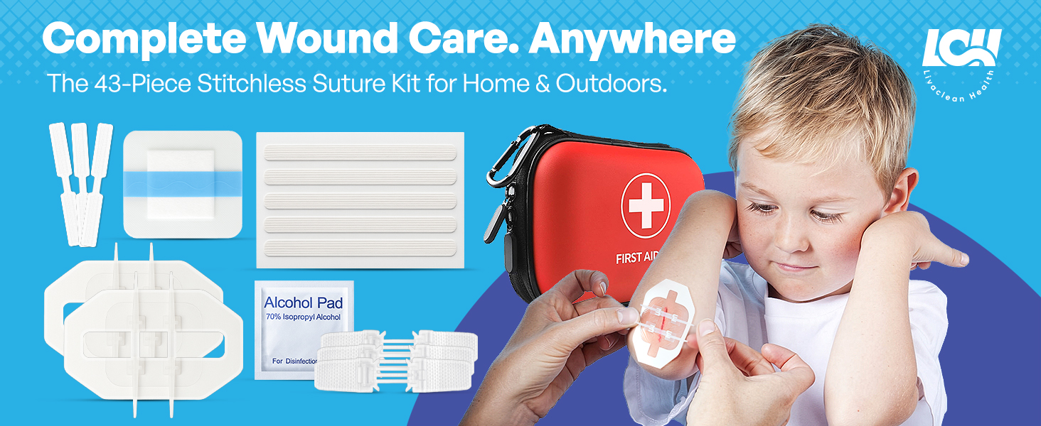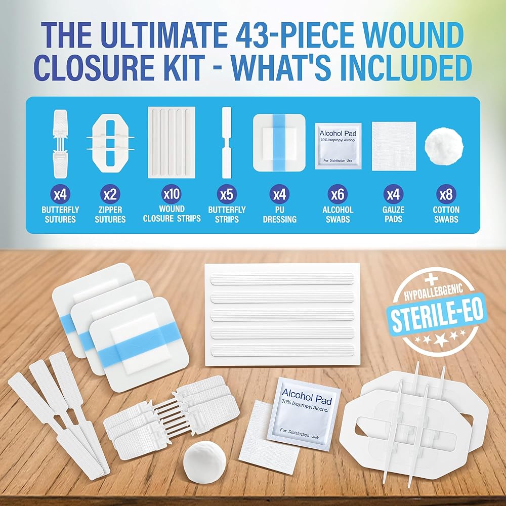 🛡️مجموعة إغلاق الجروح مكونة من 43 قطعة: مجموعة شرائط إغلاق كاملة للتمزق مع خيوط سحاب ملفوفة بشكل فردي، وإغلاقات وشرائط الفراشة، وأشرطة إغلاق الجروح، وضمادات من البولي يوريثان، ومنصات الشاش، ومسحات الكحول والقطن للجروح والخدوش البسيطة.