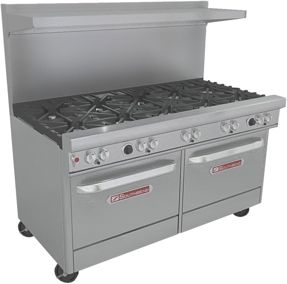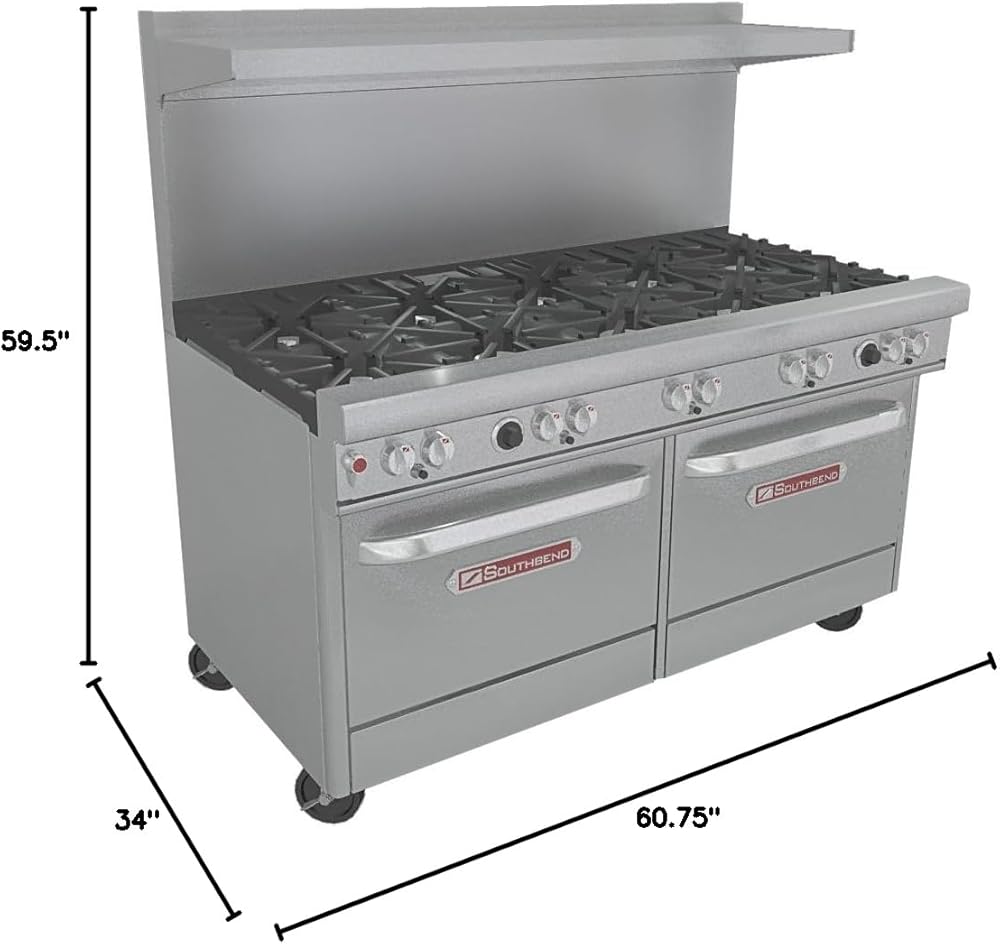 (10) Patented 33,000 BTU non-clogging top burners with lifetime warranty. (2) 45,000 BTU standard ovens Porcelain enamel interior 26''w x 26 1/2''d x 14''h. Full size bun pans fit both directions 1 rack included per oven Thermostat control 175 to 550 degrees F Front located manual gas shut-off to entire range Stainless steel 4'' front rail 2'' Ergonomically designed ''Cool Touch'' oven handle High back riser with flat shelf. 5'' or 10'' straight riser available in lieu of high back. Same price! Please specify back needed when ordering. Individual cast iron grates with 27'' deep cooking surface. Grates will hold a 14'' stock pot Standing pilot burner is standard. Battery spark ignition is optional for same price. Please specify when ordering. Removable split drip pans Stainless steel construction Factory installed gas regulator 6'' adjustable legs, standard. Casters available for $200 .Please specify when ordering. Ovens are fully front serviceable with lift-out bottom Available set for either Natural or L.P. (Propane) Gas. PLEASE specify gas choice when ordering One year parts and labor warranty