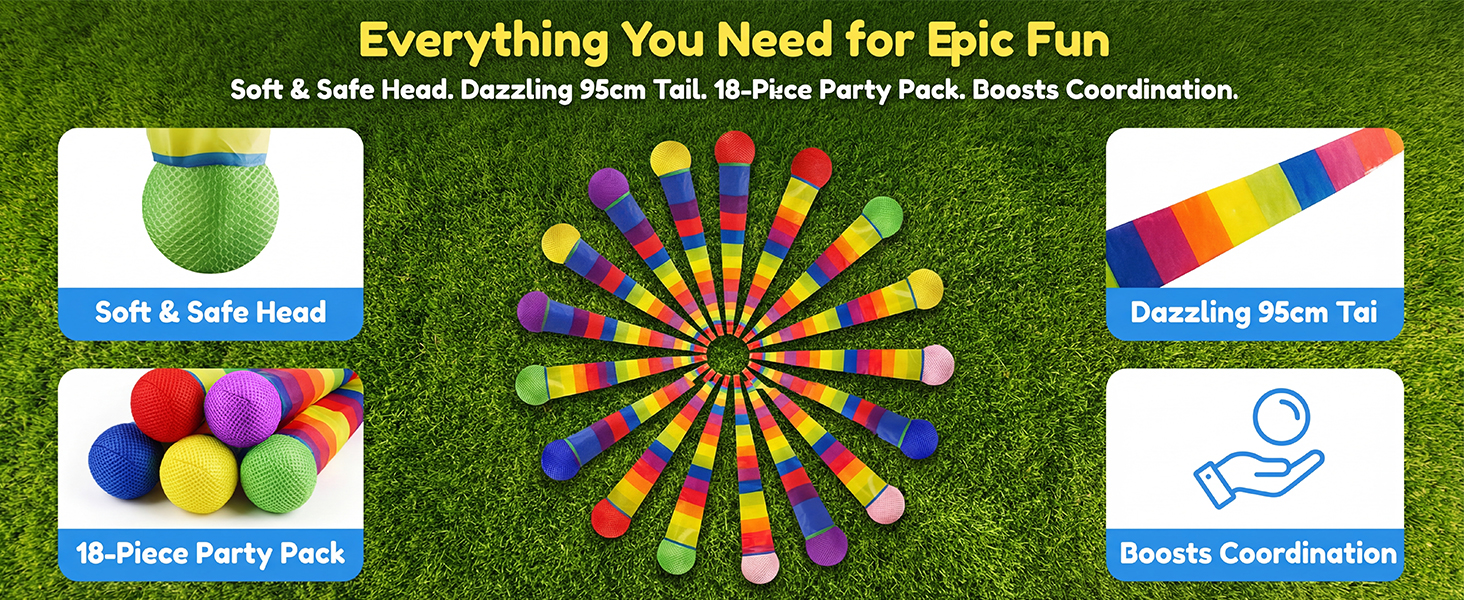 • تصميم طويل الذيل: تتميز كرة المذنب الرياضية الملونة الممتعة بطول إجمالي يبلغ 95 × 6 سم (حوالي 37.4 × 2.36 بوصة)، مع حجم كرة مريح مناسب للأطفال الصغار للإمساك بها وإمساكها بسهولة في الأيدي الصغيرة. الذيل الطويل الممتد يجعل الرمي والإمساك أسهل بكثير للأطفال، مما يساعدهم على التعلم بسرعة، وبناء الثقة بسرعة أثناء اللعب. إنها تعتمد حرفية متينة ممتازة لضمان السلامة المزدوجة، وتدعم ألعاب الرمي لمسافات طويلة سواء في الداخل أو الخارج دون عناء.