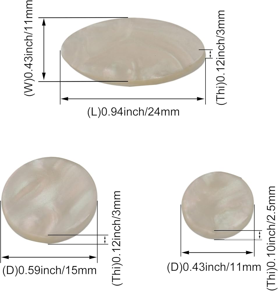 Oval buttons: 24x11x3mm/0.94"x0.43"x0.12" (LxHxT)