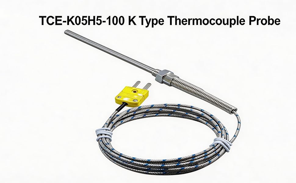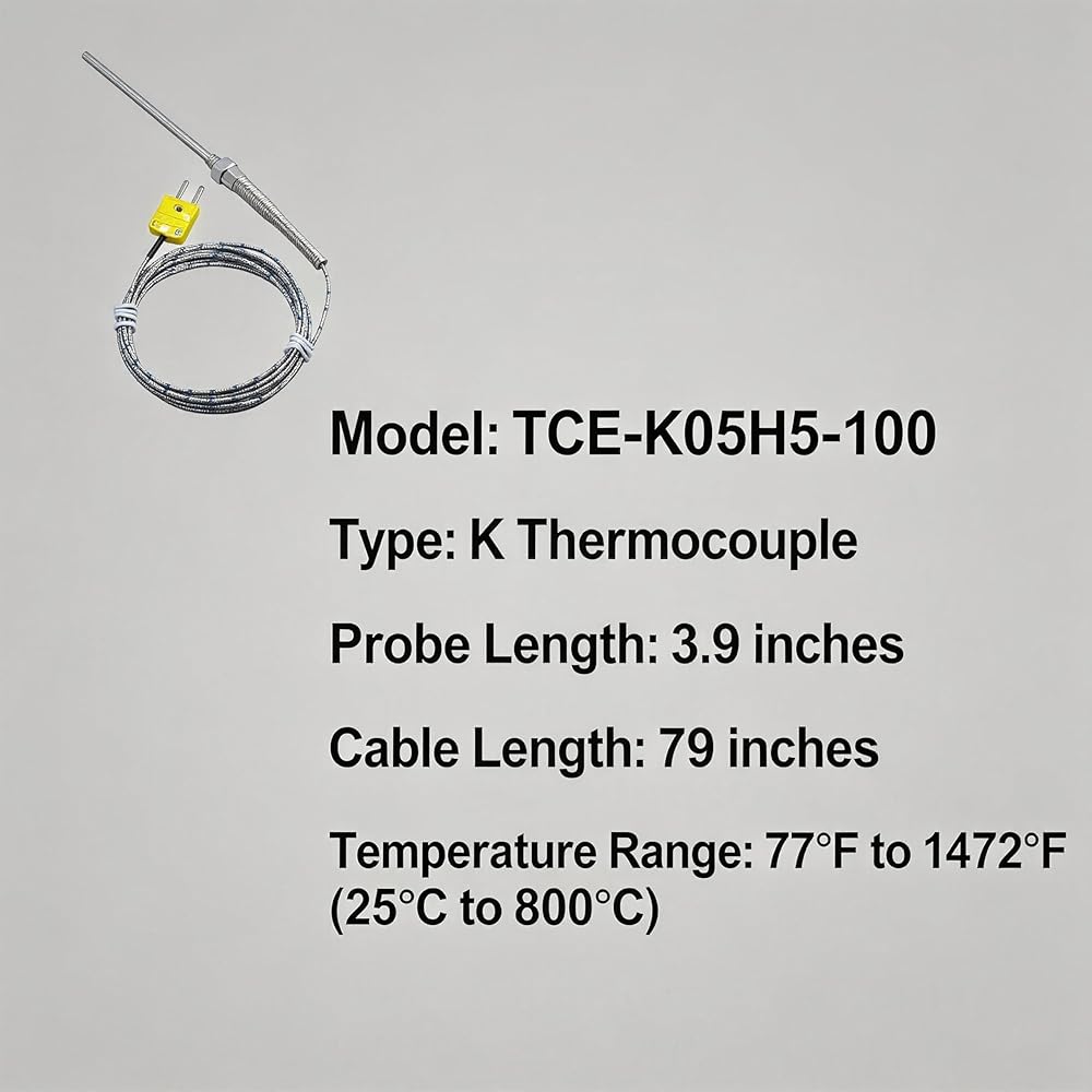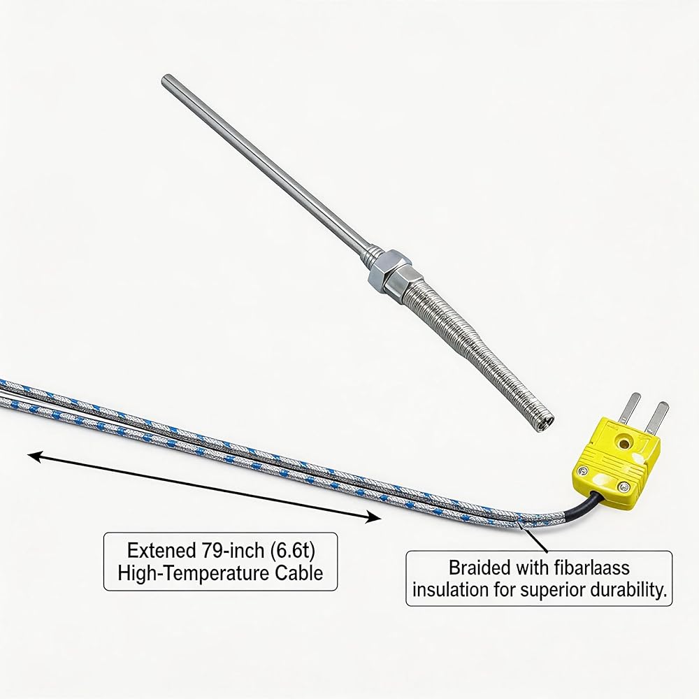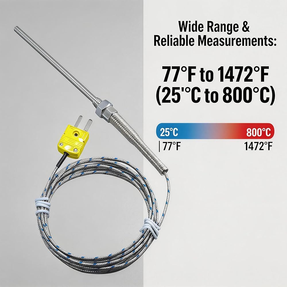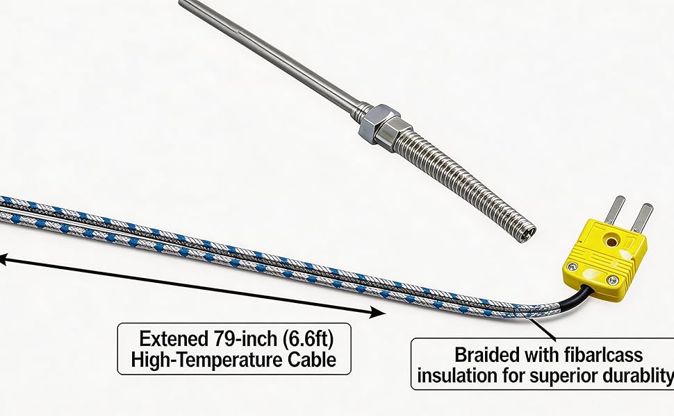 يبلغ طول المسبار الحراري من النوع K 3.9 بوصة وطول الكابل 79 بوصة. يتراوح نطاق درجة حرارة التشغيل من -50 درجة فهرنهايت إلى 1472 درجة فهرنهايت، مما يتيح مراقبة درجة الحرارة بشكل مستقر وموثوق في تطبيقات مختلفة بدءًا من خبز الطعام وحتى معالجة المعادن.