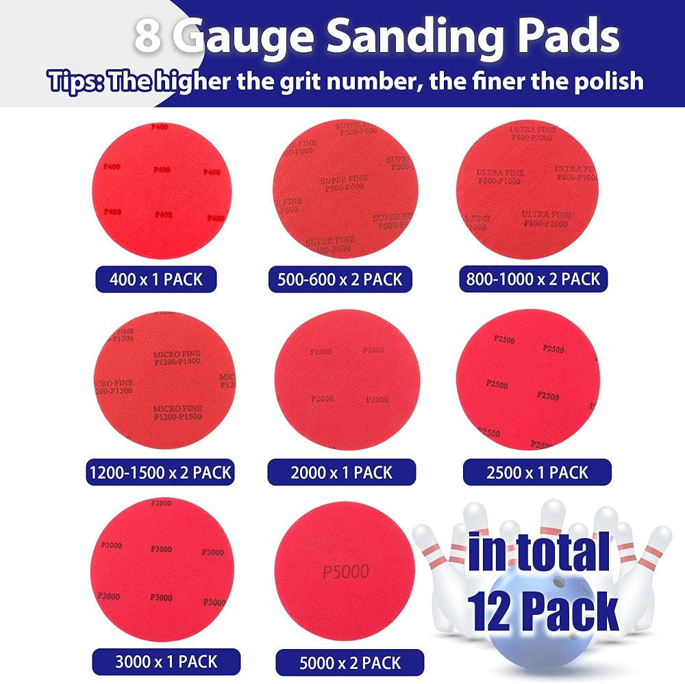 • Set Includes: You will receive 8 different grits of sanding pads, totaling 12 pieces: 400 x1, 500–600 x2, 800–1000 x2, 1200–1500 x2, 2000 x1, 2500 x1, 3000 x1, and 5000 x2. These bowling sanding pads meets all your polishing needs