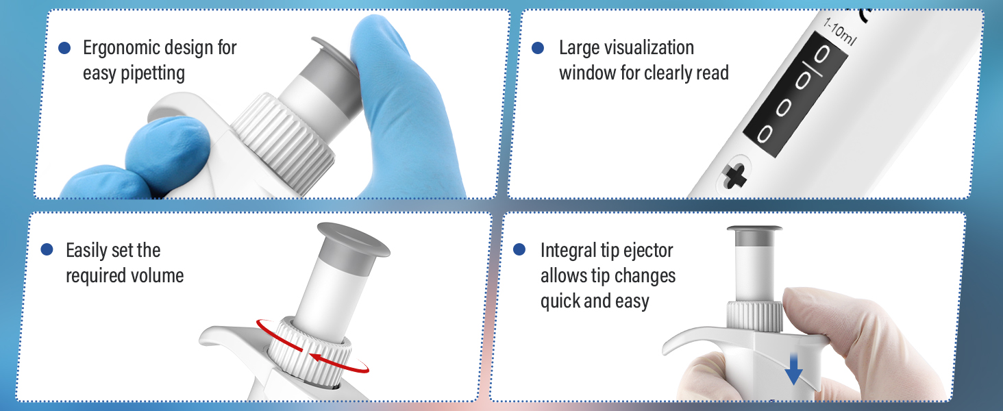 نطاق حجم الماصة: 1-10 مل؛ الزيادة: 10 ميكرولتر. مناسبة لأطراف الماصة سعة 10 مل. ما عليك سوى تدوير زر المكبس لتحديد الحجم المطلوب. يسمح القاذف ذو الطرف المتكامل بالوصول إلى الأنابيب الضيقة ويجعل تغييرات الطرف سريعة وسهلة. يرجى ملاحظة أن لون الغطاء قد يختلف بسبب اختلافات الدفعة، ولكن هذا لا يؤثر على اختيار نطاقات القياس أو الاستخدام.