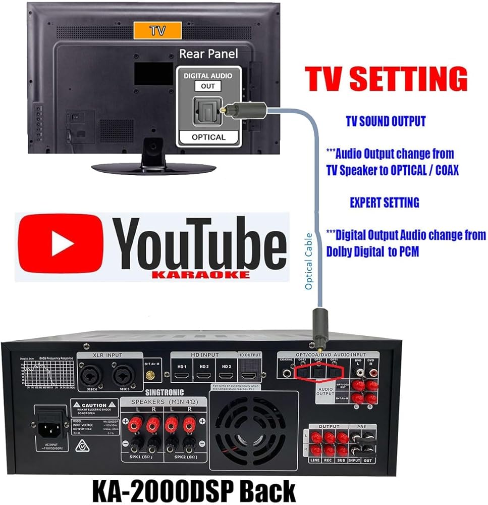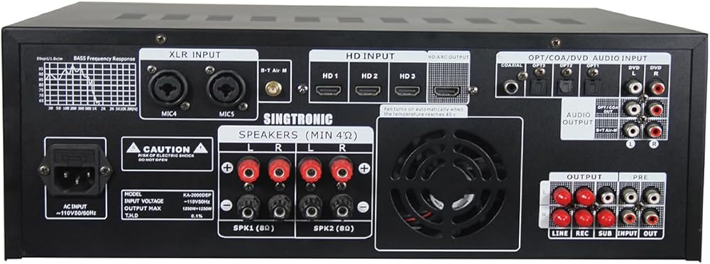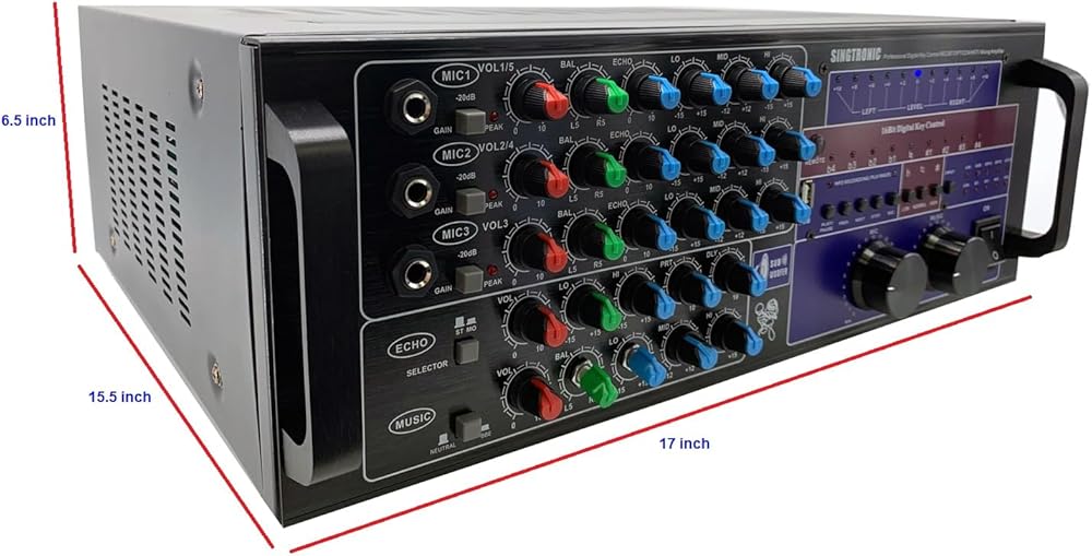 SINGTRONIC KA-2000DSP – The Ultimate 3000W Karaoke Mixing Amplifier for Professionals & Home Users! Take your karaoke experience to the next level with the Singtronic KA-2000DSP, a professional-grade digital mixing amplifier designed for DJs, KJs, and home entertainment. With 3000W power output, built-in DSP equalizer, and crystal-clear recording function, this amplifier delivers powerful, distortion-free audio for any event. 📺 Seamless Connectivity with HDMI & Bluetooth Enjoy the convenience of HDMI input/output to connect your TV or home theater system. Bluetooth Send/Receive function lets you stream music wirelessly from your smartphone, tablet, or laptop, making it easy to access thousands of songs on demand. 🎧 Advanced DSP & Customizable Equalizer Settings Customize your sound with advanced DSP technology that enhances vocal clarity and reduces background noise. Whether you're performing on stage or singing at home, you'll get studio-quality sound with zero interference. 🎶 Record & Replay Your Karaoke Sessions Capture every note with the one-touch recording function, allowing you to save and replay your best performances. Perfect for practice sessions, competitions, or sharing with friends. Hottest product from Singtronic, the world's first digital karaoke console mixing amplifier with a built-in 1500W + 1500W of hard hitting power. Equipped with a BBE