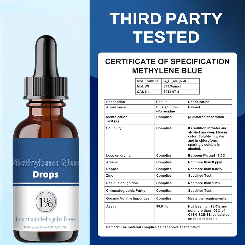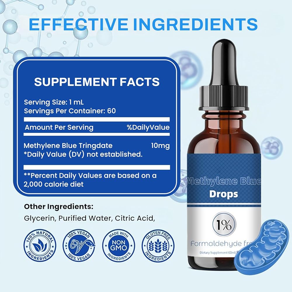 قطرات الميثيلين الزرقاء من الدرجة الصيدلانية، درجة نقاء عالية 99.99% أزرق الميثيلين للبشر، أزرق الميثان للبشر من درجة USP، مكمل 1% مع قطارة، خالٍ من الفورمالديهايد وخالي من الكحول، للسفر المحمول، 60 مل