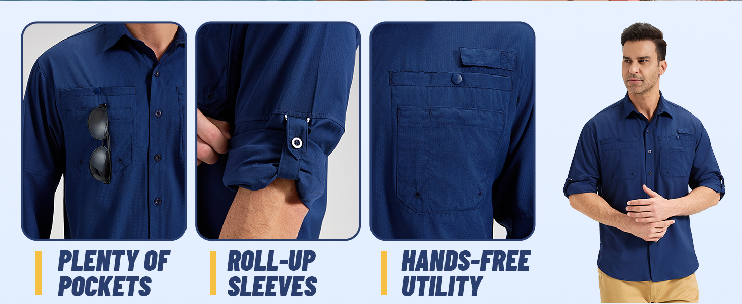 أكمام قابلة للطي: تتميز قمصان Safari لدينا بوجود عروات أزرار وحوامل أكمام قابلة للطي، مما يسمح لك بالتحويل بسهولة من الأكمام الطويلة إلى الأكمام القصيرة. التكيف على الفور مع الظروف الجوية المتغيرة أو متطلبات العمل