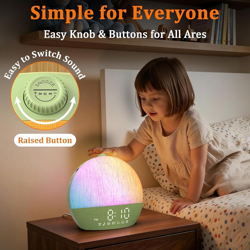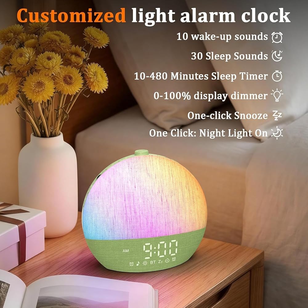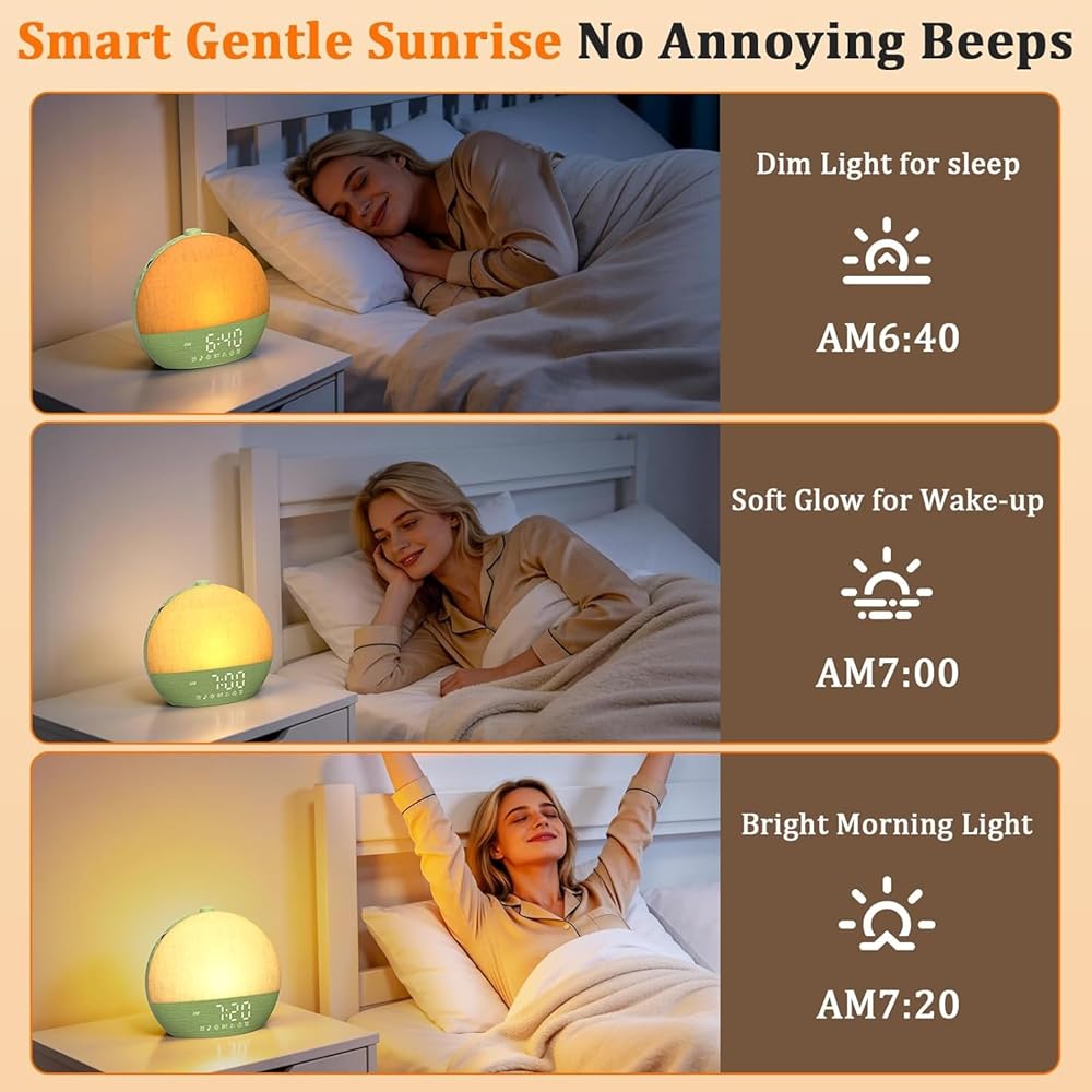 ساعة منبه هادئة وتدريجية لشروق الشمس: ضوء استيقاظ طبيعي بطيء الارتفاع لمدة 30 دقيقة - ساعة قابلة للتعتيم بـ 20 مستوى لمن ينامون بكثرة - سهولة الاستخدام محاكاة شروق الشمس مع 30 صوتًا للنوم، آلة ضوضاء بيضاء