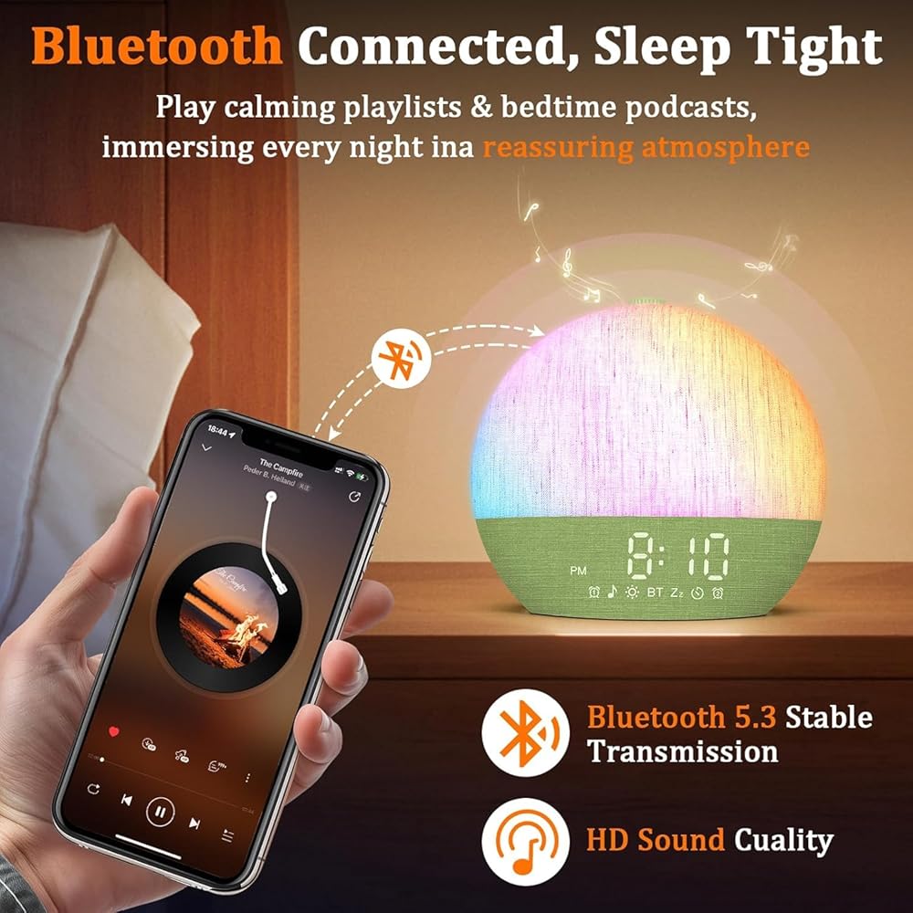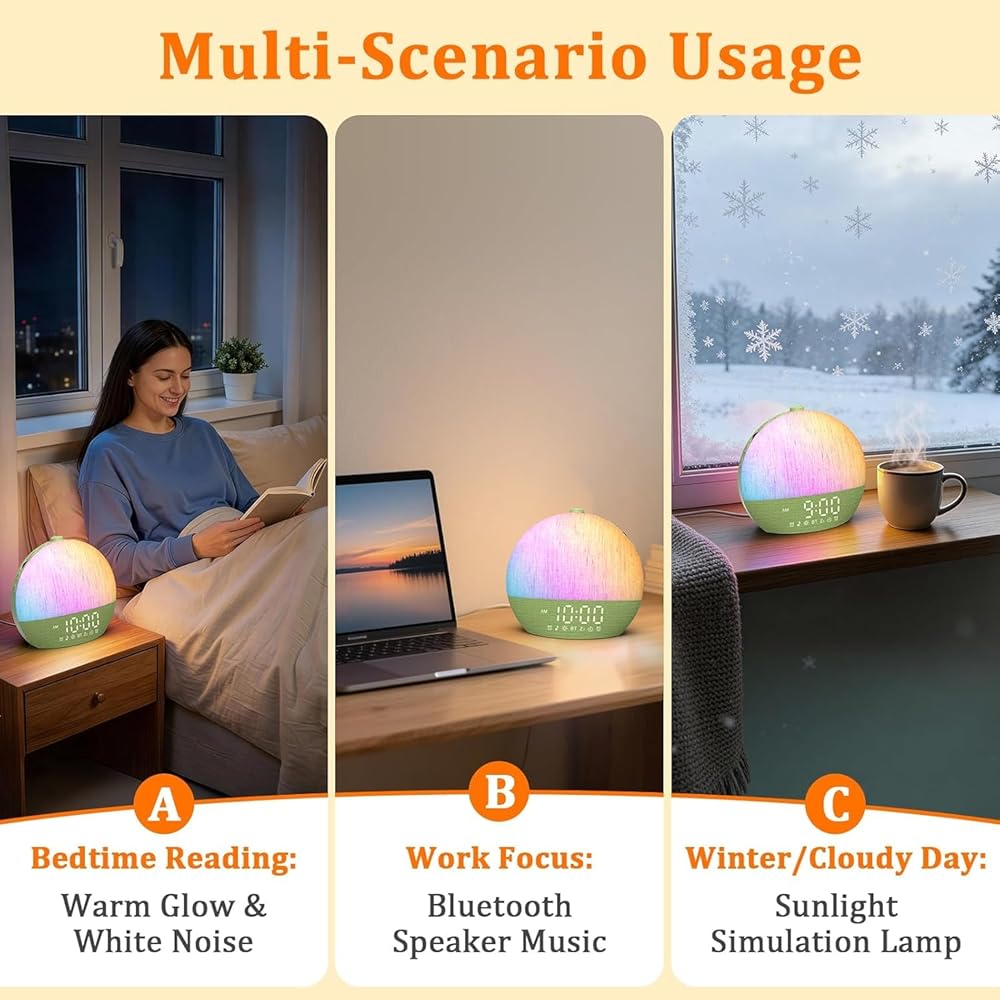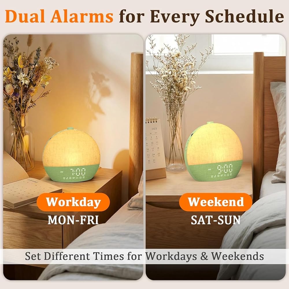 [موفر للمساحة 4 في 1] لا مزيد من طاولات السرير الفوضوية! تجمع ساعة منبه شروق الشمس 4 في 1 بين ضوء الاستيقاظ ومصباح القراءة والضوء الليلي وآلة الضوضاء البيضاء - يمكنك بث الصوت بسلاسة عبر البلوتوث - بحيث يحل جهاز واحد أنيق محل الأدوات المتعددة والأسلاك المتشابكة للحصول على مساحة أكثر نظافة وتنظيمًا.