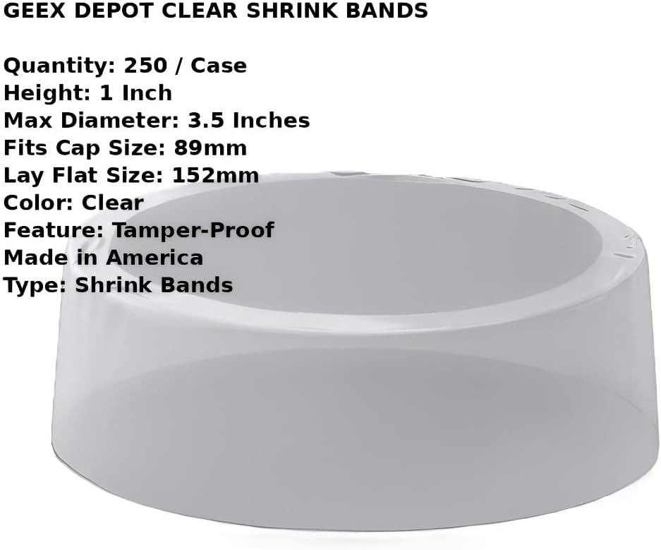 Protect your products and present them professionally with GEEX DEPOT Clear Shrink Bands with Maximum Diameter: 3 1/2" for 89mm Caps. These non-perforated shrink seals provide a visible tamper-evident layer that helps customers feel confident their container has not been opened before purchase. Designed to fit jars and bottles with standard 89mm lids, these shrink bands are widely used for food packaging, cosmetics, candles, supplements, and craft products. The clear material keeps your branding and labeling visible while delivering a clean, retail-ready appearance. Application is fast and simple. Slide the band over the cap and apply heat using a heat gun or shrink machine to form a tight, secure seal. Once shrunk, the band stays firmly in place until removed by the end user. Whether you run poa small business, sell online, or package products at home, GEEX DEPOT Shrink Bands offer a dependable solution for tamper-evident sealing, professional presentation, and product protection.