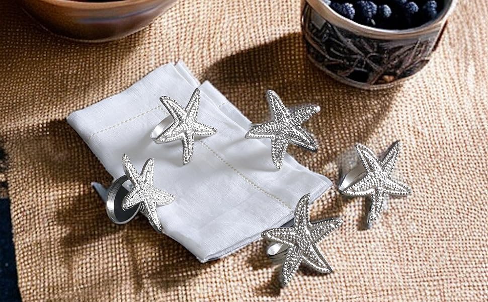 • ✅ حجم وحزمة مثالية: تتضمن المجموعة 12 حلقة مناديل على شكل نجم البحر. يبلغ مقاس كل حلقة منديل 6.35 سم × 6.35 سم × 1.75 سم، مما يوفر مساحة طاولة كاملة ومتوازنة بطابع الشاطئ.