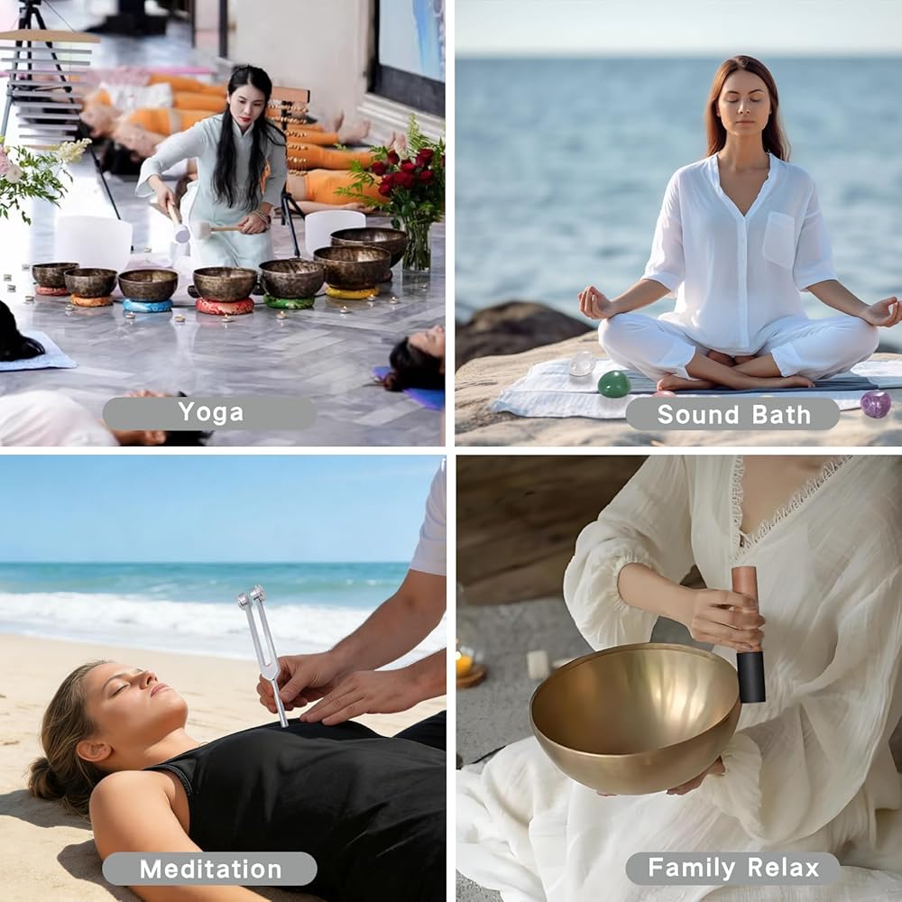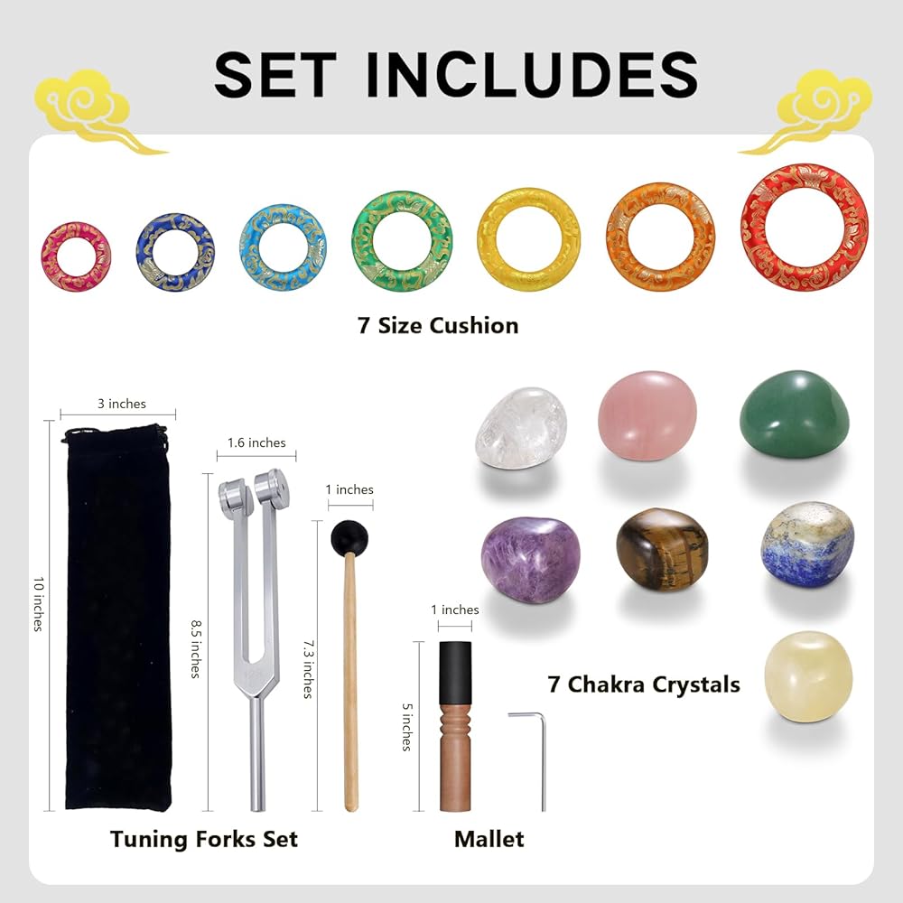 مجموعة وسائد مكونة من 18 قطعة من أوعية الغناء (بدون أوعية) - إجمالي 18 قطعة من ملحقات التأمل الصوتي لعلاج أوعية الصوت التبتية والكريستالية، تشمل: 7 قطع من وسائد وعاء الغناء، قطعة واحدة من مطرقة وعاء الغناء الخشبي، و7 كريستالات شاكرا العلاجية، وشوك ضبط 128 هرتز للشفاء. توفر لك الملحقات الأساسية للتأمل.