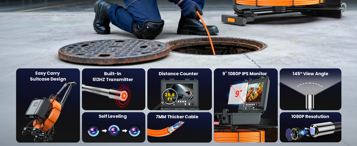 【نظام كاميرا تكبير 5X وشاشة IPS عالية الدقة مقاس 9 بوصات 】يوفر تسجيل بدقة 1080 بكسل عالية الدقة مع تكبير 5x وعدسة واسعة الزاوية 145 درجة؛ يتميز بشاشة IPS HD مقاس 9 بوصة 1080 بكسل. توفر تفاصيل حادة وألوان واقعية لفحص الأنابيب، وتحول المساحات الضيقة إلى مناطق فحص بانورامية للتعامل بسهولة مع السيناريوهات المتنوعة ومقاييس المشروع. (ملاحظة: اشطف رأس الكاميرا بالماء وتجفيفها بعد التعرض للسوائل المسببة للتآكل. حافظ على الكاميرا جافة بقطعة قماش ناعمة بعد كل استخدام.)
