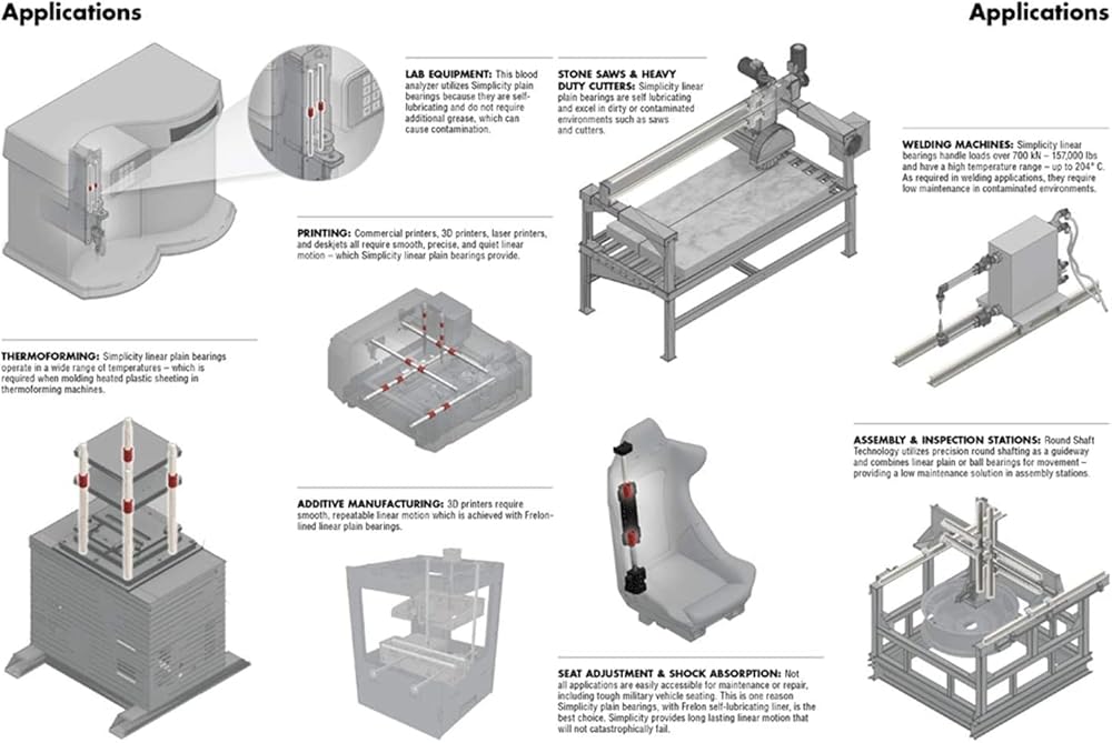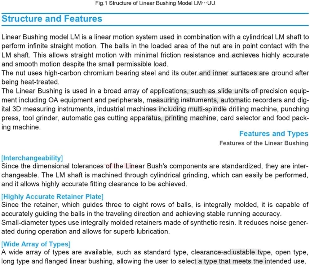 The Linear Bushing is used in a broad array of applications, such as slide units of precision equip-ment including OA equipment and peripherals, measuring instruments, automatic recorders and dig-ital 3D measuring instruments, industrial machines including multi-spindle drilling machine, punching press, tool grinder, automatic gas cutting apparatus, printing machine, card selector and food pack-ing machine.